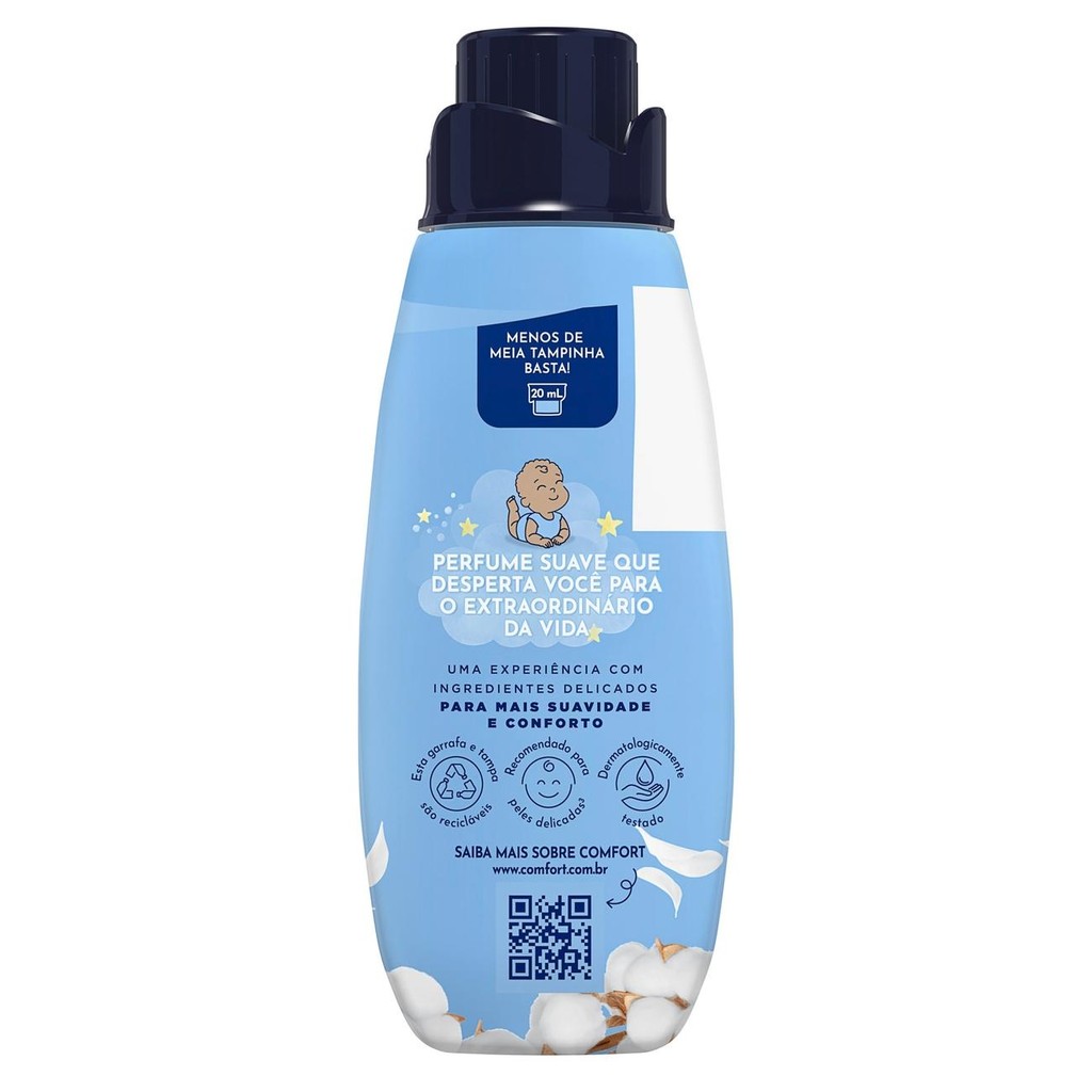 •O Amaciante Concentrado Comfort Puro Cuidado é dermatologicamente testado e foi desenvolvido para peles sensíveis, além de possuir óleo de argan em sua fórmula, perfumando e tratando! •Comfort protege as roupas dos danos da lavagem e garante uma maciez incrível. Ele ajuda a prevenir a perda da cor das roupas e protege as fibras, além de evitar bolinhas e esgarçamento •O Amaciante Concentrado Comfort Puro Cuidado garante roupas macias •Amaciante concentrado que proporciona suavidade e cuidado, com um perfume suave com extrato de aveia •A garrafa do amaciante de roupas Comfort é feita com até 50% de plástico reciclado, além de ser 100% reciclável •O Amaciante Comfort Puro Cuidado vem no formato de 500 ml, mas consegue render mais que 2 L*, pois é concentrado e tem ótimo rendimento. Menos de meia tampinha basta! O Amaciante Concentrado Comfort Puro Cuidado tem perfume suave com extrato de aveia e faz as roupas durarem muito mais! Sua nova fórmula contém óleo de argan que perfuma e trata. Além do produto previnir os danos da lavagem, mantendo as cores do tecido vibrantes por mais tempo e as roupas perfumadas. O Amaciante Comfort Puro Cuidado vem no formato de 500 ml, mas consegue render mais que 2 L*, pois é concentrado e tem ótimo rendimento. Menos de meia tampinha basta! Sua fórmula, além de ser hipoalergênica, é dermatologicamente testada por pediatras, dermatologistas e outros profissionais da saúde. Dessa forma, o Amaciante Concentrado Comfort Puro Cuidado é indicado para ser usado em roupas de bebês e de pessoas com peles sensíveis e delicadas. Sua fórmula contém extrato de aveia que penetra profundamente nas fibras do tecido durante a lavagem, deixando-as com uma maciez irresistível, toque gentil e com todo cuidado que as peles sensíveis merecem. Sua fragrância foi feita especialmente para transmitir o toque macio e suave das roupas, além de sua fórmula ser livre de corantes e das microcápsulas de perfume, componentes com alto potencial de irritabilidade para as peles mais delicadas. Os ingredientes de Comfort Concentrado são capazes de alinhar e proteger o tecido, reduzindo o atrito entre as fibras de suas roupas durante o processo de lavagem. O cuidado intensivo de Comfort funciona da mesma forma que um condicionador para cabelos: alinha os fios, mantém sua forma original e ajuda a controlar a quebra das fibras, reduzindo futuros danos nas peças. A garrafa do amaciante de roupas Comfort é feita com até 50% de plástico reciclado, além de ser 100% reciclável! *Considerando recomendação de dosagem para máquina até 8 kg (20 ml).