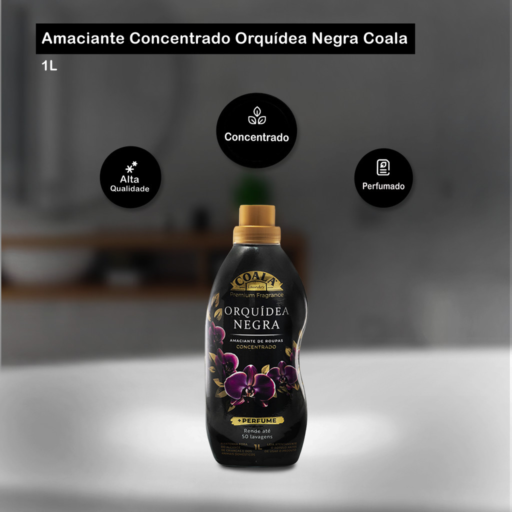 Amaciante Concentrado Orquídea Negra 1L Coala O Amaciante de Roupas Concentrado Coala é um produto premium desenvolvido para proporcionar maciez extrema e um perfume sofisticado às suas roupas. Sua fórmula concentrada rende até 50 lavagens, oferecendo um excelente custo-benefício. Além disso, é biodegradável e não irritante, alinhando-se a práticas sustentáveis. Indicação de Uso: - Lavagem de roupas brancas e coloridas. Modo de Uso: - Use ½ tampa por lavagem. Aplique no compartimento da máquina ou dilua na água do último enxágue; - No tanque, deixe agir por 5 minutos; Fragrância: Orquídea negra Embalagem: 01 frasco de 1L