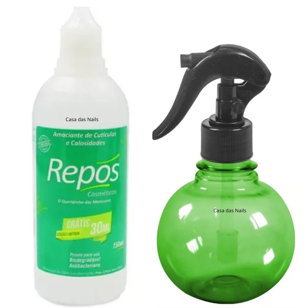 Amaciante de cutículas e calosidade líquido Repós - 120ml + Pulverizador mini bolinha 180ml - Santa Clara O Amaciante De Cutícula E Calosidade Repos é ideal para quem deseja praticidade na hora de fazer as unhas. Desenvolvido para amaciar as cutículas e calos, mesmo sem o uso de agua. É pronto para o uso, não necessita de bacia para colocar os pés ou as mãos de molho. Simples e fácil de usar, é ideal para remoção de cutículas e calosidades pois já vem diluído, facilitando a operação do profissional. Repós é fácil, prático e rápido, além de ser antibacteriano e biodegradável. Benefícios: – Antibacteriano; – Biodegradável; – Fácil manuseio; – Não possui cheiro; – Reduz o risco de contaminação; – Procedimento rápido e fácil. Modo de usar: Aplicar o produto diretamente nas cutículas, ou com a ajuda de um algodão. Aguardar de 10 a 20 segundos e retirar. Em caso de calosidade, aplicar diretamente sobre a pele afetada e esperar 3 minutos, se houver casos excessivos, pode ser usado também com água morna. Borrifador Bolinha 180ml Válvula Gatilho – Indicado para usos gerais; – Com gatilho pulverizador; Ficha Técnica: Capacidade: 180 ml Tamanho: 15 cm Obs.: A cor e o modelo do gatilho do pulverizador pode variar entre branco e preto e será enviado de acordo com a disponibilidade em estoque.