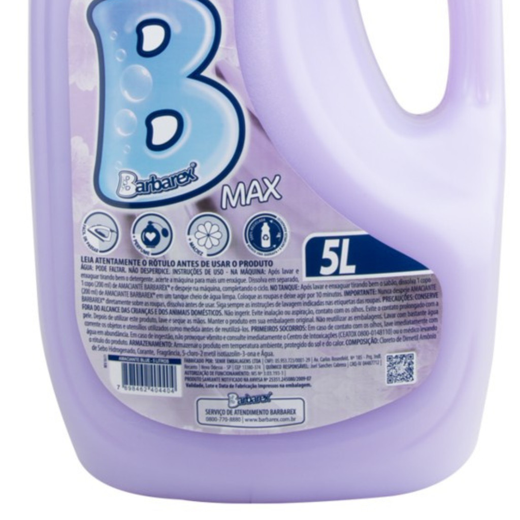 Amaciante Max Barbarex 5 litros Sua fórmula penetra na fibra dos tecidos, tornando os macios ao toque e com a sensação de roupa sempre nova e impecável. A Barbarex sabe que sentir se confortável e a vontade com uma roupa é essencial, para isso existe o amaciante de roupas Barbarex, que além do cuidado especial com o tecido, deixa um cheirinho agradável na roupa. Recomendações de Armazenamento: Mantenha o produto na embalagem original. Armazene em local fresco, seco, e protegido da luz direta e calor excessivo. Detalhes do Produto: Embalagem: 5 litros