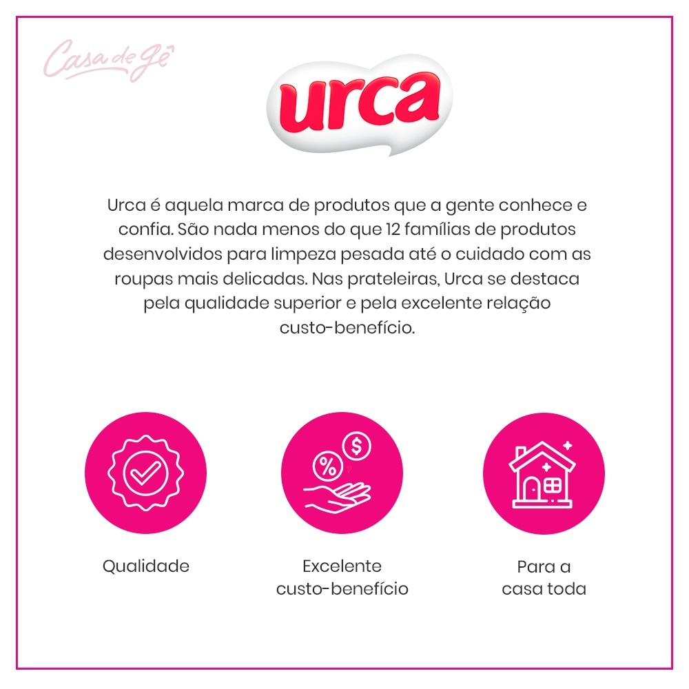 A linha de amaciantes Urca é completa em todos os sentidos. Experimente a sensação de levar o perfume do campo para as suas gavetas! Tenha o Amaciante Lavanda na sua lavanderia! Descrição Média 1.Vantagens Com ótima relação qualidade x preço, o Amaciante Urca possui cápsulas perfumadas que prolongam a perfumação no tecido e garantem facilidade para passar, devido a maciez que o produto proporciona às suas roupas. Experimente a sensação de levar o perfume do campo para as suas gavetas! 2.Características do produto (medidas/especificar quando houver variação do mesmo produto) Se você busca saber qual amaciante é melhor, eu conto pra você! Existem os amaciantes diluídos e os concentrados, e Urca oferece os dois para você! O amaciante tradicional ou clássico é aquele encontrado com mais facilidade nas prateleiras. Ele é diluído em água e, geralmente, vem em garrafas de 500ml a 5 litros. É um dos tipos mais práticos para o dia a dia, já que vem pronto, ou seja, basta acrescentar à sua lavagem. Já a versão concentrada do produto é também líquida, porém mais espessa do que o amaciante tradicional. O seu nome se dá porque ele tem menos água na sua fórmula, portanto, o produto é mais puro, logo, mais concentrado. Ele rende uma quantidade maior de lavagens do que a sua versão diluída e, por conta da concentração, deve ser usado em quantidades menores. Experimente o poder do Amaciante Urca Brisa da Primavera nas embalagens de 2, 3 e 5 litros! Detalhes técnicos: Unidade: Embalagem com Amaciante Urca Brisa da Primavera - 5L Dimensões da embalagem: 18,9cm(L)x 14,3cm(P)x32cm(A) Vida útil: 24 meses 3.Composição (do que é feito o produto)/ Especificações técnicas Tensoativo Catiônico Coadjuvantes Conservante Corante Fragrância Veículo Contém: Sal De Quaternário De Amônio. Descrição Longa 4. Modo de usar (o da embalagem) Adicione ½ copo (80 ml) de Amaciante Urca previamente diluído na água do último enxágue ou no compartimento da máquina de lavar. Importante: siga as instruções de lavagem contidas nas etiquetas das roupas. Nunca aplique o produto diretamente sobre as roupas. Lave com bastante água corrente os objetos e utensílios utilizados como medida antes de reutilizá-los. Mantenha o produto em sua embalagem original e ao abrigo da luz 5. Dica de Gê Combine o Amaciante Urca com os lava roupas líquidos ou lava roupas em pó Urca, garantindo a limpeza completa das suas peças e deixando um perfume incrível!