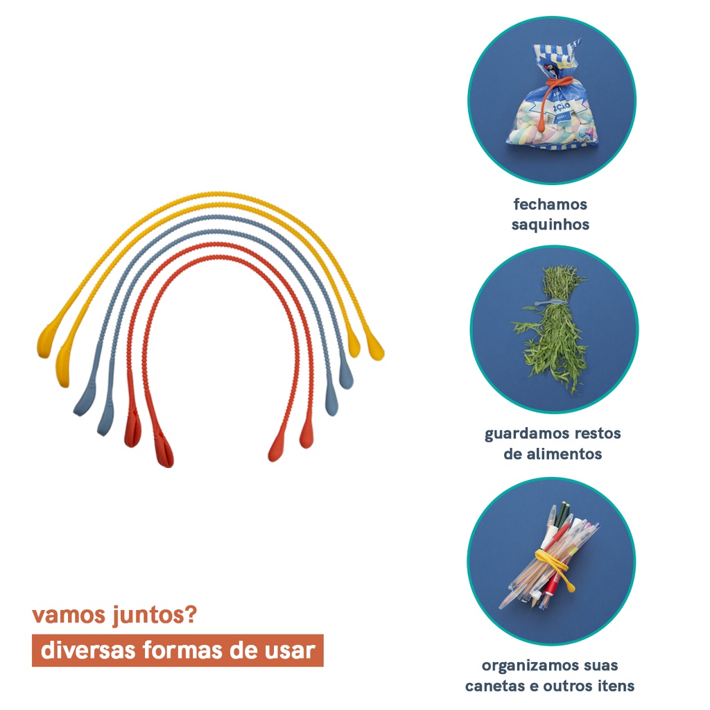 Esse é o conjunto com 6 amarradores de silicone da OIKOS. Muito versáteis: eles servem para rechear alimentos, fechar saquinhos e agrupar diferentes itens - na cozinha ou no resto da casa, você que manda. Maleáveis, longos e resistentes: são boas alternativas ao uso de palitos de dente, arames e cordas durante o preparo de alimentos. Versátil e seguro: como o silicone vai no forno e no freezer, um leque de receitas é possível - e sem essa de se machucar com um palito de dente deixado para trás na comida! Durante o preparo: são usados para manter a comida bem juntinha, como rocambole, frango recheado, peru de natal e mais.