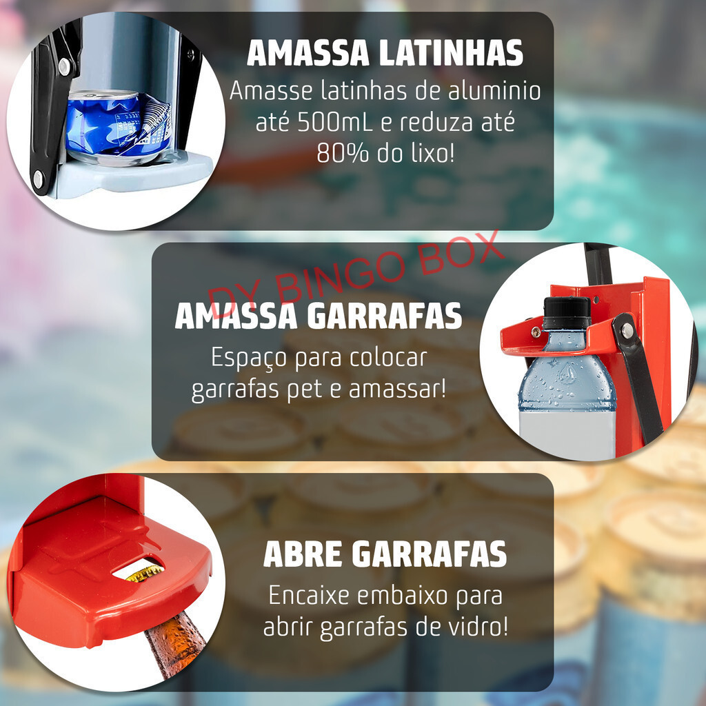 ~~~~~~~~~~~~~~~~~~BEM-VINDOS DY BINGO BOX~~~~~~~~~~~~~~~~~~~~~~~~~~~ Amassador de Latinhas e Latões de até 500ml em Aço Inoxidável - Com Abridor de Garrafa Embutido Apresentamos um amassador de latas e latões em aço inoxidável que é uma ferramenta prática e versátil para reciclagem e conveniência. Além de amassar latas de até 500ml, ele também possui um abridor de garrafa embutido para maior utilidade. Características Principais: - Amassamento Eficiente: Este amassador é capaz de reduzir latas e latões de até 500ml em um tamanho compacto, economizando espaço e facilitando o armazenamento. - Construção em Aço Inoxidável: Fabricado em aço inoxidável de alta qualidade, é resistente à corrosão e durável, garantindo longa vida útil. - Abridor de Garrafa Embutido: Além de amassar latas, ele possui uma função adicional como abridor de garrafas, tornando-o uma ferramenta multifuncional. - Fácil de Usar: Possui uma alavanca ergonômica que facilita o amassamento das latas com pouco esforço. - Sustentabilidade: Amassar latas é uma maneira eficaz de economizar espaço em sua lata de lixo e contribuir para a reciclagem. Este amassador de latas e latões é uma adição conveniente para sua cozinha, área de churrasco ou qualquer lugar onde você deseje facilitar o descarte e a reciclagem de latas. Sua construção robusta e abridor de garrafa embutido o tornam uma ferramenta versátil que ajuda a cuidar do meio ambiente e a simplificar tarefas diárias. Obrigado pela sua atenção! A vida é maravilhosa por sua causa!