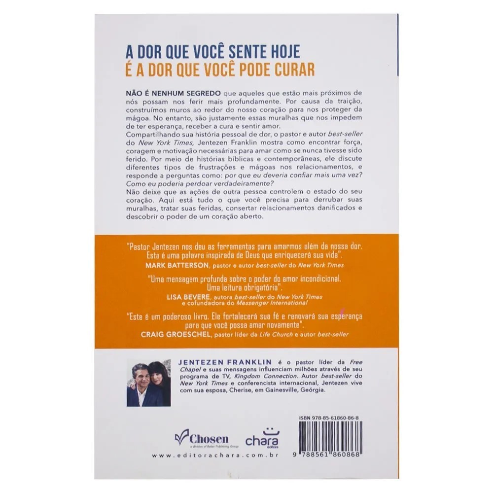 Ame Como Se Nunca Tivesse Sido Ferido NÃO É NENHUM SEGREDO que aqueles que estão mais próximos de nós possamos nos ferir mais profundamente. Devido à traição, construímos muros ao redor do nosso coração para nos proteger da mágoa. No entanto, são justamente essas muralhas que nos impedem de ter esperança, receber a cura e sentir amor. Compartilhando sua história pessoal de dor, o pastor e autor best-sller do New York Times, Jentezen Franklin mostra como encontrar força, coragem e motivação necessárias para amar como se nunca tivesse sido ferido. Por meio de histórias bíblicas e contemporâneas, ele discute diferentes tipos de frustrações e mágoas nos relacionamentos, e responde a perguntas como: por que eu deveria confiar mais uma vez? Como eu poderia perdoar verdadeiramente? Não deixe que as ações de outra pessoa controlem o estado do seu coração. Aqui está tudo o que você precisa para derrubar suas muralhas, tratar suas feridas, consertar relacionamentos danificados e descobrir o poder de um coração aberto. Título: Ame Como Se Nunca Tivesse Sido Ferido Subtitulo: Esperança, Cura e o Poder de um Coração Aberto Autor: Jentezen Franklin Páginas: 240 Formato: 15 x 21 x 1 cm Peso: 0. 326gg ISBN: 9788561860868 Editora: Chara