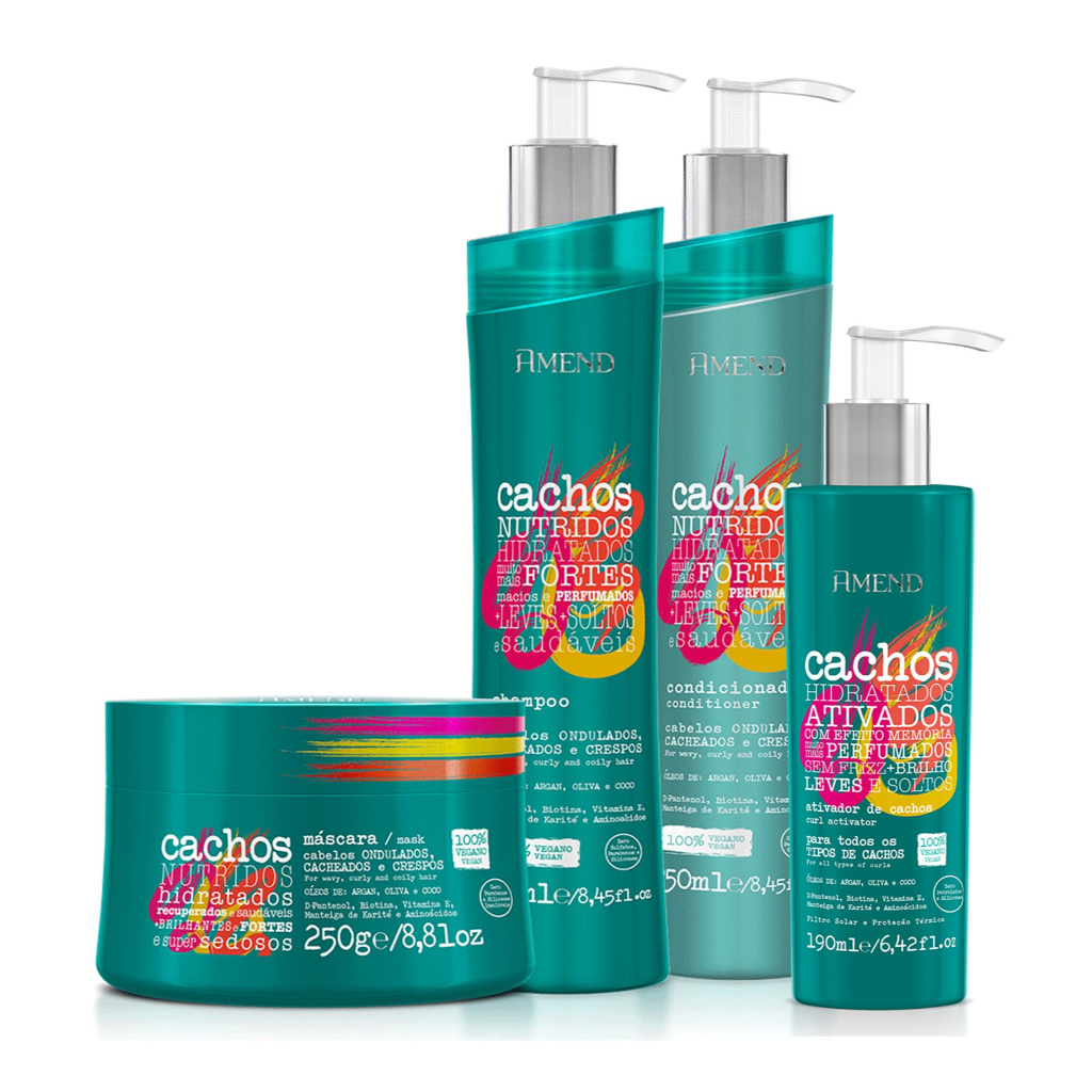 SHAMPOO PARA CABELOS CACHEADOS AMEND CACHOS 250ML Shampoo para Cabelos Cacheados Amend Cachos promove um cuidado especial aos seus cachos, é um shampoo livre de sulfatos, parabenos e petrolatos que limpa sem agredir os fios. Sua fórmula é enriquecida com os ativos: D-Panthenol e Manteiga de Karité que hidratam e suavizam; Biotina que auxilia na prevenção da queda e fortalece; Vitamina E com ações antioxidantes; um blend de Aminoácidos que reparam profundamente os cachos e um mix de óleos incríveis que protegem, nutrem, regeneram e dão movimento. Seus cachos ficarão tratados como você nunca viu! MÁSCARA PARA CABELOS CACHEADOS AMEND CACHOS 250G Máscara para Cabelos Cacheados Amend Cachos facilita sua rotina semanal de cuidados com o cabelo, de alta performance, enriquecida com os ativos: D-Panthenol e Manteiga de Karité que hidratam e suavizam; Biotina que auxilia na prevenção da queda e fortalece; Vitamina E com ações antioxidantes; um blend de Aminoácidos que reparam profundamente os cachos e um mix de óleos incríveis que protegem, nutrem, regeneram e dão movimento aos seus cachos. CONDICIONADOR PARA CABELOS CACHEADOS AMEND CACHOS 250ML Condicionador para Cabelos Cacheados Amend Cachos promove um cuidado especial com seus cachos, desenvolvemos uma linha enriquecida com os ativos: D-Panthenol e Manteiga de Karité que hidratam e suavizam; Biotina que auxilia na prevenção da queda e fortalece; Vitamina E com ações antioxidantes; um blend de Aminoácidos que reparam profundamente os cachos e um mix de óleos incríveis que protegem, nutrem, regeneram e dão movimento. Seus cachos ficarão tratados como você nunca viu! ATIVADOR DE CACHOSA AMEND 190ML Ativador de Cachos Amend Cachos proporciona a definição ideal para todos os tipos de cachos. A fórmula hidratante e de alta performance ajuda a formar os cachos já existentes pois foi enriquecida com os ativos: D-Panthenol e Manteiga de Karité, que eliminam o aspecto áspero e ressecado suavizando os fios; Biotina que auxilia na prevenção da queda e fortalece; Vitamina E que tem ação antioxidante; um blend de Aminoácidos que reparam profundamente os cachos e um mix de óleos incríveis que protegem, nutrem, regeneram e eliminam o frizz. Possui filtro solar para proteger a cor e proporciona proteção térmica contra o calor do secador. Se encante com cachos hidratados, controlados, d