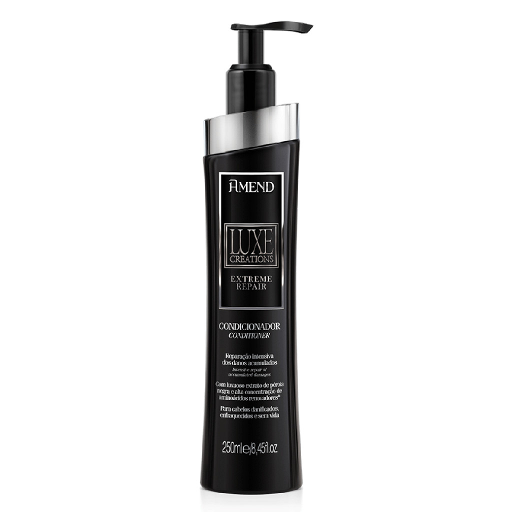 01 SHAMPOO AMEND LUXE CREATIONS EXTREME REPAIR 250ML 01 CONDICIONADOR AMEND LUXE CREATIONS EXTREME REPAIR 250ML 01 MÁSCARA AMEND LUXE CREATIONS EXTREME REPAIR 250G CARACTERÍSTICAS: Shampoo Amend Luxe Creations Extreme Repair é elaborado com alta concentração de ativos que reparam intensamente os danos acumulados causados pelo estresse mecânico, químico, térmico e ambiental. Combatem os sinais de envelhecimento capilar (cabelos opacos, fracos e desidratados), evitam o desbotamento da cor e recuperam rapidamente os fios mantendo-os hidratados, fortes e brilhantes. Condicionador Amend Luxe Creations Extreme Repair é elaborado com alta concentração de ativos que reparam intensamente os danos acumulados causados pelo estresse mecânico, químico, térmico e ambiental. Combatem os sinais de envelhecimento capilar (cabelos opacos, fracos e desidratados), evitam o desbotamento da cor e recuperam rapidamente os fios mantendo-os hidratados, fortes, brilhantes e com a cutícula selada. Máscara Amend Luxe Creations Extreme Repair nutre intensamente combinando um sistema de aminoácidos que repõem a estrutura natural dos fios, agindo como um reforçador interno do cabelo e reparando os danos acumulados. Com alta concentração de ativos que combatem os sinais de envelhecimento capilar (cabelos opacos, fracos e desidratados), evitam o desbotamento da cor e recuperam rapidamente os fios, mantendo-os hidratados, fortes, brilhantes e blindados de futuras agressões. AÇÃO: Com alta concentração de ativos e Extrato de Pérola Negra, limpa reparando os danos causados pelo estresse mecânico, químico, térmico e ambiental. Combate os sinais de envelhecimento capilar, evita o desbotamento da cor e recupera os fios, mantendo-os hidratados, fortes e brilhantes. Com alta concentração de ativos e Extrato de Pérola Negra que condicionam e reparam os danos causados pelo estresse mecânico, químico, térmico e ambiental. COMO USAR: Aplicar nos cabelos molhados, massageando os fios com as pontas dos dedos. Enxágue e repita a operação. Após lavar os cabelos passar o condicionador. Após lavar os cabelos com o Shampoo Luxe Creations Extreme Repair, retire o excesso de água com uma toalha e aplique a máscara do comprimento dos fios até as pontas massageando mecha por mecha. Deixe agir por 03 minutos. Enxágue bem. Se desejar, aplique a seguir o condicionador para selar as cutículas.