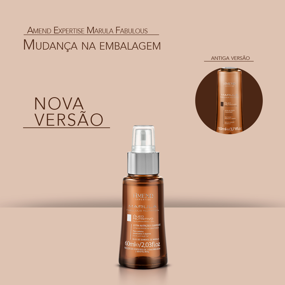 Shampoo Nutritivo Amend Expertise Marula Fabulous Nutrition limpa os fios sem agredí-los. Proporciona a nutrição necessária para os fios com aparência áspera e ressecada e que perderam a sua oleosidade natural. Protege, hidrata e acrescenta elasticidade aos cabelos trazendo vitalidade, brilho, maciez e suavidade aos fios sem pesar. AÇÃO Limpa os fios, proporcionando a nutrição necessária para os cabelos com aparência áspera e ressecada. PRINCÍPIOS ATIVOS Óleo de Semente de Marula (possui alta concentração de Vitamina E). Sem Sal. COMO USAR Aplicar nos cabelos molhados, massageando suavemente. Comece pelo comprimento e depois leve a espuma até o couro cabeludo. Óleo Nutritivo Amend Expertise Marula Fabulous Nutritioncom propriedade reparadora e altamente hidratante, proporciona nutrição profunda e aumento da maciez da fibra capilar. AÇÃO Com propriedade reparadora e altamente hidratante, proporciona nutrição profunda e aumento da maciez dos fios. PRINCÍPIOS ATIVOS Óleo de Semente de Marula. COMO USAR Aplicar nos fios úmidos ou secos e finalize como de costume.