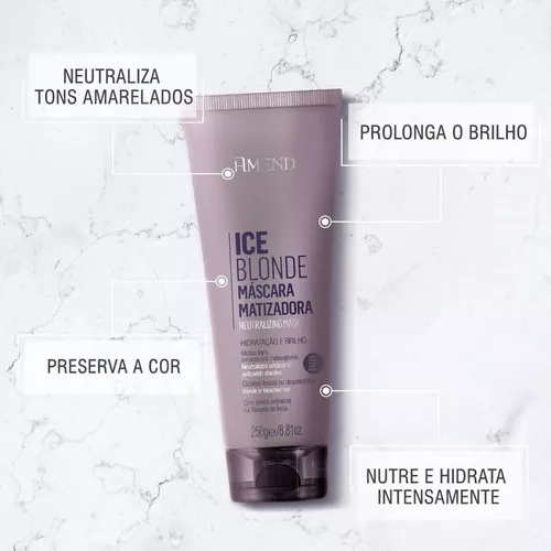 Máscara Matizadora Amend Ice Blonde ideal para ser usada entre as colorações ou descolorações. Possui pigmentos que matizam imediatamente, neutralizando os tons amarelados indesejáveis. Os ingredientes ativos auxiliam na recuperação dos cabelos, nutrindo e hidratando intensamente a fibra dos fios fragilizados. Prolonga o brilho, protege contra os raios UV e preserva a cor. AÇÃO Possui pigmentos que matizam imediatamente, neutralizando os tons amarelos indesejáveis. PRINCÍPIOS ATIVOS Com ativos extraídos da Tâmara da Índia.