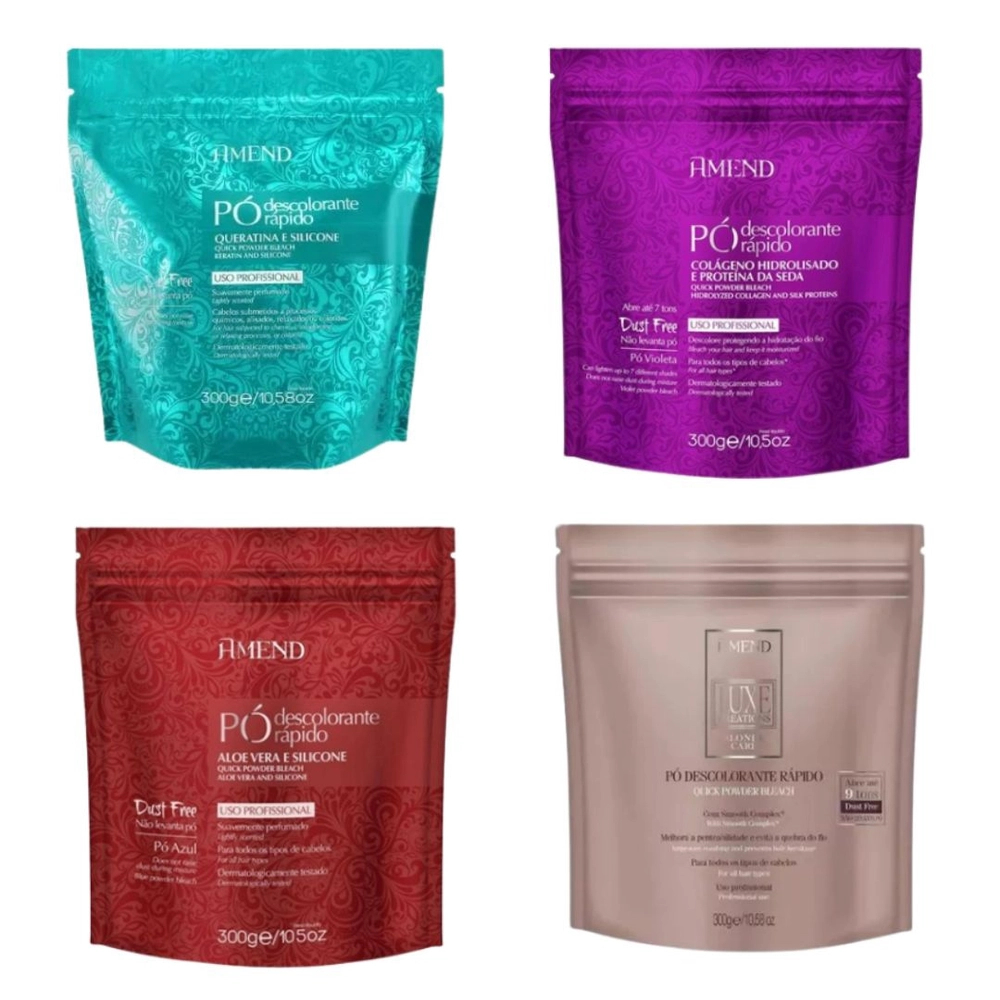 Pó Descolorante Rápido Amend Luxe Creations possui em sua fórmula o exclusivo smooth complex, que oferece condicionamento extra aos fios melhorando a penteabilidade, diminuindo a quebra e deixando os fios mais suaves e macios. Apresenta excelente resultado ao agir de forma rápida em técnicas de descoloração, tais como clareamento total, mechas, reflexos, ballayagens e luzes. Abre até 9 tons, proporciona aos cabelos clareamento homogêneo, mantém a resistência da fibra capilar durante o processo. Fórmula dust free: manuseio com agradável perfume, sem levantar pó. IMPORTANTE: Siga rigorosamente as instruções de uso. Antes de usar, faça a prova de toque e o teste de mecha. USO PROFISSIONAL. AÇÃO Oferece condicionamento extra aos fios melhorando a penteabilidade, diminuindo a quebra e deixando os fios mais suaves e macios. PRINCÍPIOS ATIVOS Com Smooth Complex.