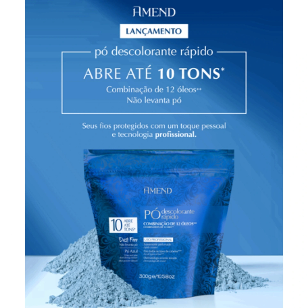 Amend Pó Descolorante Rápido 300g - Com 12 Óleos Descoloração eficaz e rápida com o Pó Descolorante Amend, enriquecido com uma combinação exclusiva de 12 óleos, incluindo Argan, Coco, e Macadâmia. Oferece proteção e hidratação superior, prevenindo o ressecamento e mantendo os fios suaves e nutridos. Ideal para técnicas de clareamento, mechas, reflexos e luzes. Dermatologicamente testado e com ação Dust Free, facilita a aplicação sem levantar pó. Abre até 10 tons. COMO USAR 1 - Em um recipiente não metálico, misture o pó descolorante com Água Oxigenada Amend Color Intensy 40 volumes na proporção de 1:2 (uma medida de pó para duas de água oxigenada). 2 - Utilize uma espátula ou pincel não metálico para obter uma mistura homogênea. 3 - Aplique a mistura sobre os cabelos secos e não lavados, começando pela nuca ou áreas mais escuras. 4 - Para retoque de raízes, aplique somente nas áreas de crescimento, evitando o contato com a parte já descolorida. 5 - Após o tempo de ação desejado, lave bem os cabelos para remover todo o produto. IMPORTANTE: Faça o teste de toque e o teste de mecha antes da aplicação. Tempo de ação deve ser controlado pelo profissional conforme o clareamento desejado. Siga rigorosamente as instruções de uso. ATENÇÃO CUIDADO: Contém substâncias passíveis de causar irritação na pele de determinadas pessoas. Antes de usar, faça a prova de toque e o teste de mecha. Manter fora do alcance das crianças. Não usar nos cílios e sobrancelhas. Em caso de contato com os olhos, lavar com água em abundância e procurar um médico. Não usar em crianças. O uso indevido deste produto pode causar danos no organismo em geral. Usar luvas adequadas. Este preparo somente deve ser usado para o fim a que se destina, sendo PERIGOSO para qualquer outro uso. ***Pode ser usado em todos os tipos de cabelos que estejam em condições saudáveis. Contém amônia. USO EXTERNO.