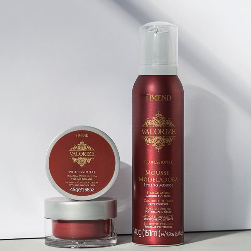Amend Valorize - Mousse Modeladora 140g Mousse modeladora. De fixação média, estiliza os fios, diminui o arrepiado e deixa um toque macio, com brilho bonito e natural. forma uma camada flexível em torno do cabelo altamente resistente à umidade e que ajuda no controle do volume. Ainda traz ativos hidratantes que conferem uma aparência saudável ao visual, além de possuir proteção térmica. Conselho de Aplicação Agite bem antes de usar. Vire o bico para baixo e aplique a mousse na palma da mão. Distribua uniformemente sobre os cabelos lavados e levemente úmidos (secos com a toalha). Modele como desejar. Para retirar o produto dos cabelos, escove ou lave normalmente.