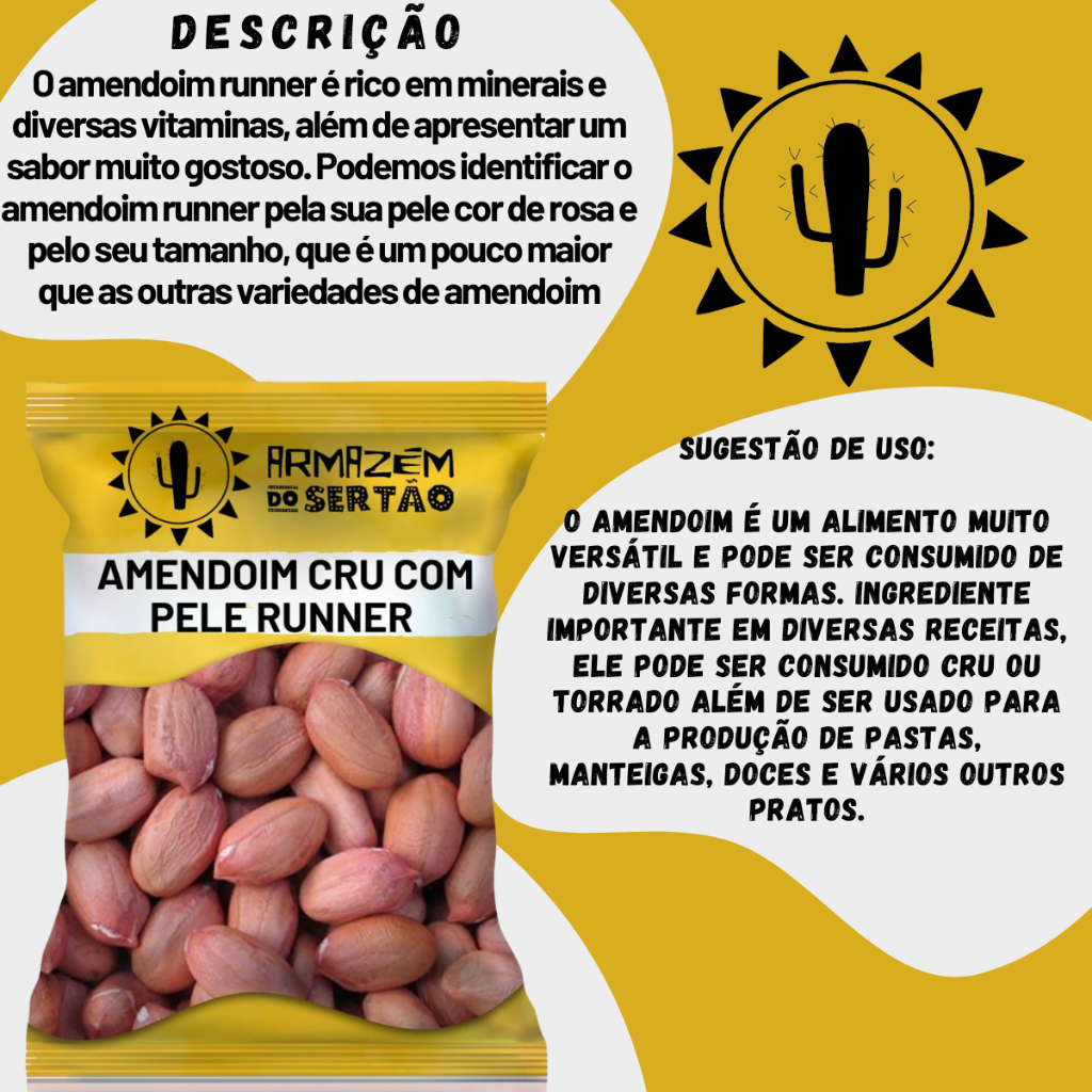 Descrição: O amendoim runner é rico em minerais e diversas vitaminas, além de apresentar um sabor muito gostoso. Podemos identificar o amendoim runner pela sua pele cor de rosa e pelo seu tamanho, que é um pouco maior que as outras variedades de amendoim. Entretanto, é importante lembrar que esse alimento é rico em diversos sais minerais e vitaminas, além de fibras que são essenciais para o bom funcionamento do intestino. Os músculos também são beneficiados pelo amendoim, já que ele pode auxiliar quem está em busca de definição e formação de massa magra. Além disso, alguns nutrientes presentes na oleaginosa podem ser benéficos para a prevenção de doenças como: mal de Alzheimer, câncer e cálculo biliar. Um alimento muito potente. Benefícios - Ajudar a tratar e prevenir a osteoporose - Diminuir as cãibras porque o magnésio e o cálcio ajudam na contração muscular; - Evitar as contrações antes do tempo na gravidez devido ao magnésio - Diminuir a retenção hídrica porque apesar de não ser um alimento diurético, a amêndoa tem potássio e magnésio que ajudam a reduzir o inchaço; - Diminuir a pressão alta porque a amêndoa também tem potássio. Sugestão de Uso: O amendoim é um alimento muito versátil e pode ser consumido de diversas formas. Ingrediente importante em diversas receitas, ele pode ser consumido cru ou torrado além de ser usado para a produção de pastas, manteigas, doces e vários outros pratos.