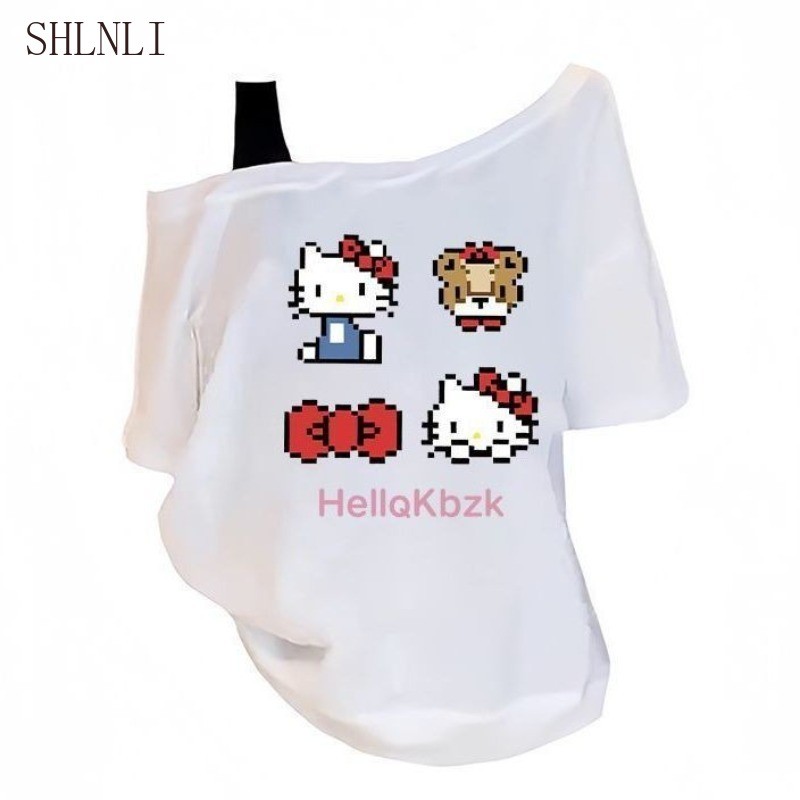 Americano Doce Impresso Cruz Ombro Manga Curta Camiseta Verão Feminino Solto E Emagrecimento Fora Do Topo