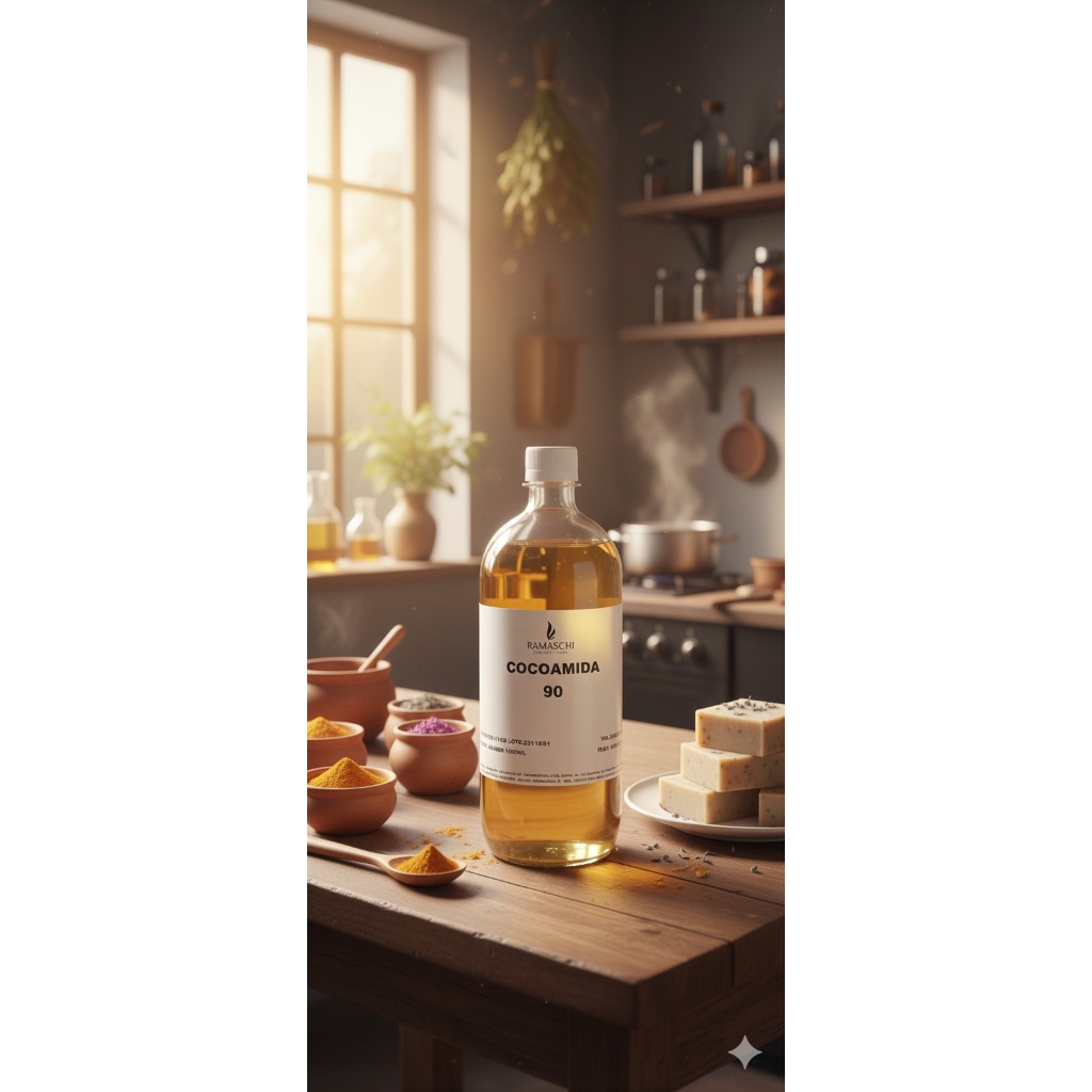 A Amida 90 (ou Cocamide DEA) é um tensoativo não iônico de alta pureza (90-94%) e é amplamente utilizada em formulações de cosméticos e produtos de limpeza devido às suas propriedades espessantes, estabilizantes e sobreengordurantes. Especificações Técnicas Nome Químico Comum: Dietanolamida de ácidos graxos de coco. Nome INCI: Cocamide DEA. Número CAS: 68603-42-9. Pureza: Possui um teor de amida de 90% a 94%, sendo considerada uma "super amida" em comparação com a amida 60 ou 80. Aparência Física: Líquido viscoso, grosso, de cor amarelada e transparente, que pode cristalizar em temperaturas baixas. Solubilidade: Baixa solubilidade em água, mas é facilmente solubilizada na presença de outros tensoativos mais hidrofílicos, como os lauril sulfatos. Principais Benefícios e Aplicações A Amida 90 é um ingrediente multifuncional essencial para a formulação de diversos produtos: Espessante: É um agente espessante eficaz, aumentando a viscosidade de shampoos, sabonetes líquidos, géis de banho e detergentes, o que melhora a textura e a experiência de uso. Estabilizante de Espuma: Ajuda a estabilizar e melhorar a qualidade da espuma produzida pelos tensoativos aniônicos (como o lauril). Sobreengordurante (Reposição Lipídica): Repõe a oleosidade natural da pele e do cabelo, que pode ser removida pela ação de detergentes, proporcionando hidratação e prevenindo o ressecamento. Solubilizante: Auxilia na solubilização de óleos e fragrâncias nas formulações cosméticas. Antiestático: Possui propriedades antiestáticas, sendo benéfica em produtos para o cabelo. Versatilidade de Aplicação: Ideal para produtos de higiene pessoal (shampoos, sabonetes líquidos, cremes para barbear) e produtos de limpeza (detergentes, desengraxantes). Clarificação: Ajuda a diminuir o ponto de turvação das formulações, melhorando a clareza e a aparência final dos produtos.
