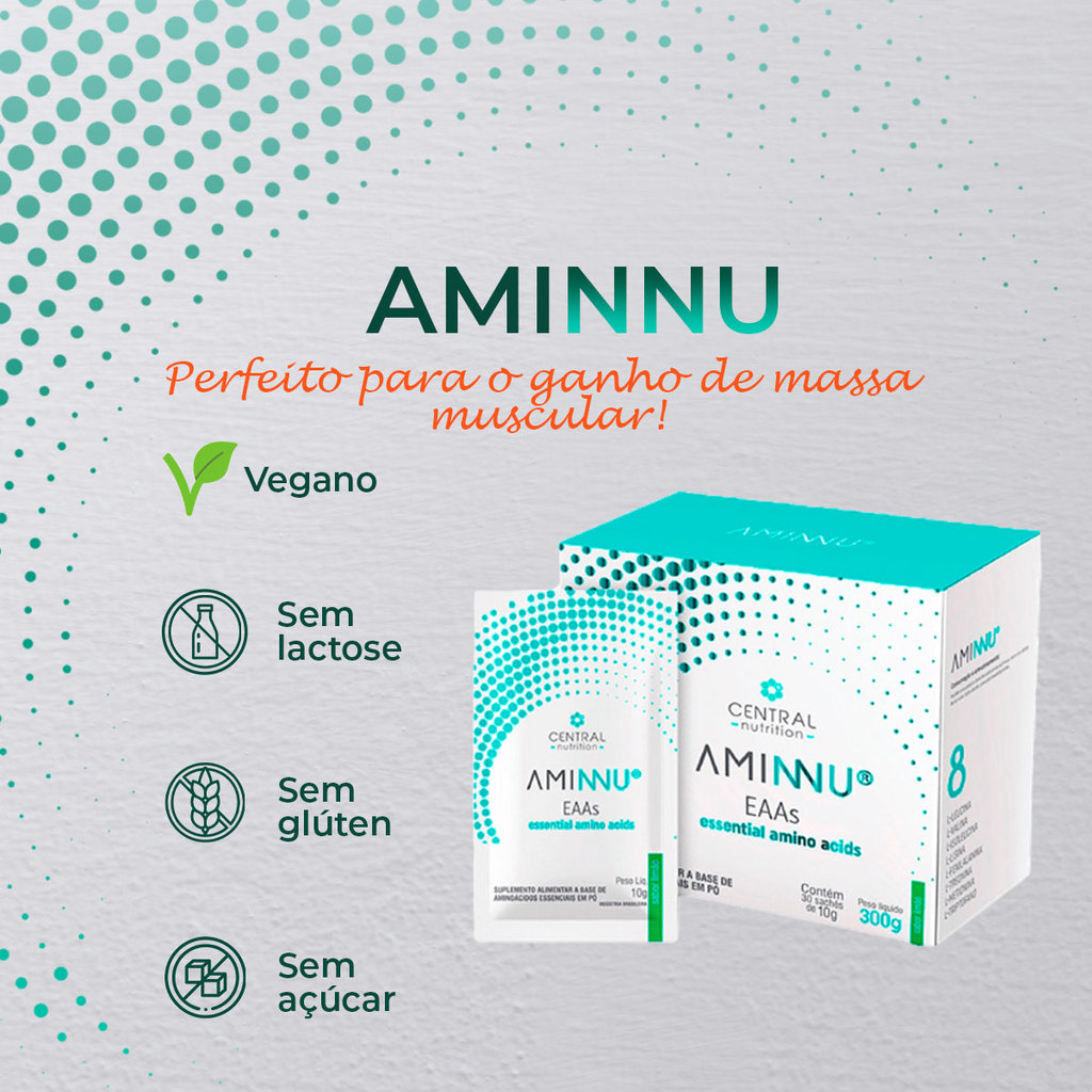 INFORMAÇÕES DE DESTAQUE • Vegano • Sem lactose • Aminoácidos de origem 100% vegetal • Sem soja • Fórmula limpa • Com aminoácidos essenciais • Rápida absorção • Sem adição de açúcares ou adoçantes artificiais • Baixo teor calórico • Adoçado com Stévia e Xilitol • Baixa alergogenicidade • Sem glúten DESCRIÇÃO Aminnu é um suplemento alimentar desenvolvido com oito aminoácidos essenciais em proporções específicas, com foco em uma fórmula prática e com alta solubilidade. Elaborado com ingredientes de origem vegetal, sem lactose, soja ou ingredientes artificiais, é uma opção vegana com perfil limpo e eficiente para complementar a ingestão diária de aminoácidos. INGREDIENTES L-Leucina, L-Valina, L-Isoleucina, L-Lisina, L-Fenilalanina, L-Treonina, L-Metionina, L-Triptofano, xilitol, estévia, clorofila, goma xantana, ácido cítrico, aroma idêntico ao natural de limão. NÃO CONTÉM GLÚTEN. SUGESTÃO DE USO Diluir 1 sachê (20 g) em 150 ml de água. Agitar até homogeneizar e consumir imediatamente. Pode ser ingerido 1 a 2 vezes ao dia ou conforme orientação profissional. IMPORTANTE Gestantes, nutrizes e crianças até 3 anos devem consumir este produto somente sob orientação de nutricionista ou médico. Conservar em local seco, fresco (entre 15 °C e 30 °C), protegido da luz e da umidade. Não consumir fora do prazo de validade.
