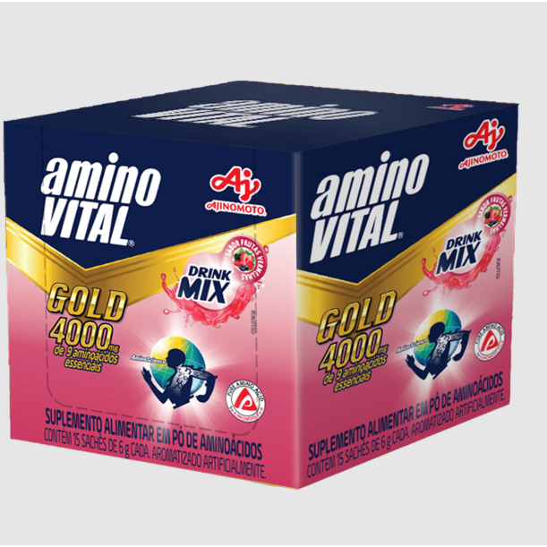 uplemento aminoVITAL Gold Drink Mix Frutas Vermelhas 6 g: mistura funcional com 9 aminoácidos essenciais que favorecem a recuperação muscular e o desempenho — embalagem em sachê individual, sabor frutas vermelhas para praticantes de atividade física. EAN 7891132165124