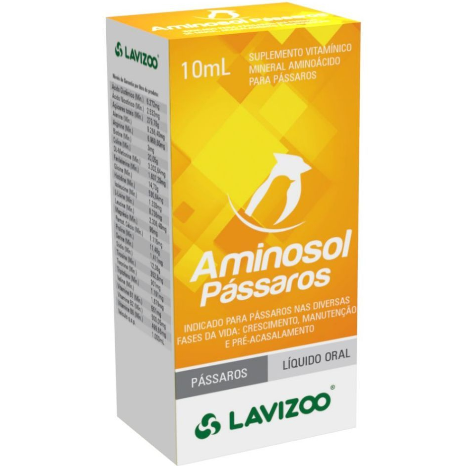 Aminosol é indicado para para pássaros nas diversas fases de vida, como: crescimento, manutenção e pré acasalamento. Modo de usar: Administrar 3mL para cada litro de água limpa (9 gotas para cada 100mL de água) ou 6mL para cada kg de ração. Fabricante: Lavizoo