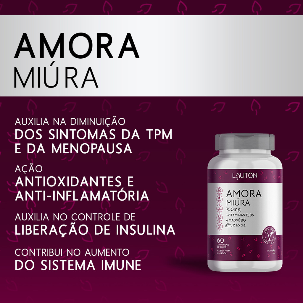 INFORMAÇÕES DE DESTAQUE 750 mg de Amora Miúra Vitaminas E, B6 e Magnésio Livre de crueldade em animais Zero glúten Zero lactose Zero açúcar 100% vegano DESCRIÇÃO O suplemento de Amora Miúra da Lauton Nutrition, enriquecido com vitaminas E, B6 e magnésio, oferece uma opção prática e eficiente para complementar a rotina de saúde. Desenvolvido para auxiliar no bem-estar hormonal, especialmente para mulheres em diferentes fases, este produto contém uma fórmula vegana, livre de glúten, lactose e açúcar, oferecendo uma solução conveniente para a sua alimentação diária. COMPOSIÇÃO Vitamina K2 - MK7 (Menaquinona), antiumectantes celulose microcristalina, estearato de magnésio, dióxido de silício e estabilizante polivinilpirrolidona. Não contém glúten. SUGESTÃO DE USO Tomar 1 comprimido ao dia com água ou conforme recomendação profissional.