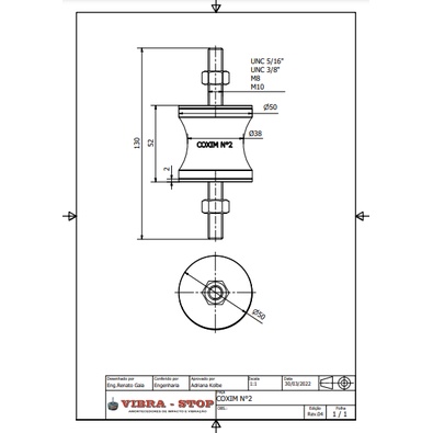 DISTRIBUIDO POR C–JAÚ FERRAMENTAS AMORTECEDOR DE VIBRACAO TIPO COXIM 2-3/8" O Amortecedor Vibra Stop Coxim é ideal para uso em motores de baixa, media e alta rotações, balanças, ventiladores, geradores, equipamentos de ar condicionado, entre outros, amortecendo impactos e vibrações com alto nível de qualidade, garantindo segurança e resistência. São desenvolvidos de forma a reduzir as vibrações à níveis muito baixos ou até mesmo nulos, reduzindo as despesas de instalação, quando comparado ao problemático processo de chumbagem direta ao piso e economizando tempo, considerando a repetição do processo de chumbagem no caso de mudança de sua empresa. Benefícios Possui um material de alta qualidade, com possibilidade de amortecimento de grandes impactos, além disso, o Amortecedor Vibra Stop Coxim é compacto e muito fácil de ser instalado. O Amortecedor Vibra Stop Coxim contem um modelo inteligente e pratico que se adequa para diversos ramos da indústria, garantindo uma solução pratica, segura e eficiente para impactos e vibrações. Características O Amortecedor Vibra Stop Coxim foi projetado em formato de carretel com uma geometria côncava, possui em sua composição a borracha, que é responsável pelo ótimo desempenho no amortecimento, garantindo flexibilidade e resistência à compressão, à tração e ao cisalhamento. ESPECIFICAÇÕES: Capacidade de carga por compressão: 150,0Kg; Capacidade de carga por tração: 30,0Kg; Diâmetro: 50,0mm; Altura: 50,0mm; Altura da borracha + parafuso: 130,0mm; Dureza da borracha: 60 shore A; Deflexão: 1,8mm / 150Kg; Parafusos de ajuste: 3/8". APLICAÇÕES: Motores de baixa, média e alta rotação, grupos geradores, equipamentos de ar condicionado, etc. IMAGENS MERMANETE ILUSTRATIVAS
