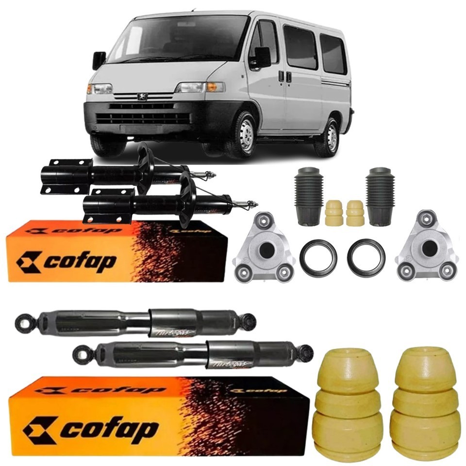 Este anúncio contém: 01 (um) Par de Amortecedor Dianteiro Turbogás; Marca: Cofap; Código: GP52948M; 01 (um) Kit do amortecedor dianteiro direito, contendo coxim com rolamento, batente e coifa; Marca: Recrin; Código: 5684-5; 01 (um) Kit do amortecedor dianteiro esquerdo, contendo coxim com rolamento, batente e coifa; Marca: Recrin; Código: 5685-5; 01 (um) Par de Amortecedor Traseiro; Marca: Cofap; Código: GL12831; 01 (um) Kit do amortecedor traseiro, contendo batente; Marca: Recrin; Código: 6656-0; Atenção: O Anúncio contém fotos reais do produto. Acompanha Certificado de garantia e nota fiscal. Obs: A garantia do produto só será feita, mediante a apresentação do certificado de garantia, que vai com o produto, corretamente preenchido pelo cliente. Garantia de fábrica para os produtos Cofap: 6 meses. Obs: Garantia para os produtos Recrin: 3 meses. Aplicação: Montadora: Citroën; Veículo: Jumper; Motor: Todos os modelos; Ano de fabricação: 1997, 1998, 1999, 2000, 2001, 2002, 2003, 2004, 2005, 2006, 2007, 2008, 2009, 2010, 2011, 2012, 2013, 2014. Montadora: Fiat; Veículo: Ducato; Motor: Todos os modelos; Ano de fabricação: 1998, 1999, 2000, 2001, 2002, 2003, 2004, 2005, 2006, 2007, 2008, 2009, 2010, 2011, 2012, 2013, 2014, 2015, 2016. (Observação: 10 Furgão / 15 Cargo) Montadora: Peugeot; Veículo: Boxer; Motor: Todos os modelos; Ano de fabricação: 1997, 1998, 1999, 2000, 2001, 2002, 2003, 2004, 2005, 2006, 2007, 2008, 2009, 2010, 2011, 2012, 2013, 2014, 2015, 2016, 2017. Dúvidas frequentes: - O Produto é novo? Sim. Nós trabalhamos apenas com produtos novos, e com garantia. - O Produto é original? Sim. Nós só trabalhamos com distribuidores homologados pelo fabricante. - O produto é igual ao da foto? Sim. Todas as fotos são fieis ao que você receberá. - Em quanto tempo recebo minha compra? É muito simples, basta colocar seu CEP no calculador de frete do anúncio. - Como faço para saber se o produto deste anúncio se aplica ao meu veículo? Na descrição do anúncio você encontra todas as informações das aplicações corretas, se a informação que precisa não está na descrição do anúncio, deixe sua pergunta que nossa equipe de especialistas está preparada para solucionar qualquer dúvida. - Tem alguma dúvida sobre o produto ou sobre a compra? Deixe sua pergunta abaixo, que responderemos prontamente. Atendimento: Nosso horário de atendimento é: 24 horas Temos uma Equipe de Atendimento e Suporte Técnico à disposição. Após a compra, caso tenha alguma dúvida ou algum problema com o seu produto, entre em contato conosco utilizando os canais informados pelas mensagens de pós-venda ou pelo próprio chat de atendimento. • O cumprimento do prazo de entrega é de total responsabilidade da Transportadora e esse prazo é informado no momento da compra podendo ser alterado por condições logísticas. Importante: • Somos Loja Oficial Shopee; • Todos os nossos produtos são checados e bem embalados antes da expedição. • Recomendamos sempre que toda e qualquer instalação seja realizada por profissionais especializados para evitar problemas futuros, pois não somos responsáveis pela má instalação ou mau uso do produto. • Confira se os dados cadastrais estão atualizados, principalmente se o endereço de entrega está correto para evitar que o seu produto retorne e mantenha o número de contato atualizado para que possamos entrar em contato caso necessário. Quem somos: Somos uma empresa, localizada no Rio de Janeiro, com mais de 50 anos de mercado no segmento de atacado e distribuição de Auto Parts em geral. Hoje, a Rhino conta com mais de 10.000 produtos em seu portfólio nos segmentos de refrigeração automotiva, arrefecimento automotivo, suspensão automotiva, mecânica em geral, moto parts e acessórios automotivos. RHINO AUTOPARTS - O Maior E-commerce de Autopeças e Acessórios Automotivos do Brasil.