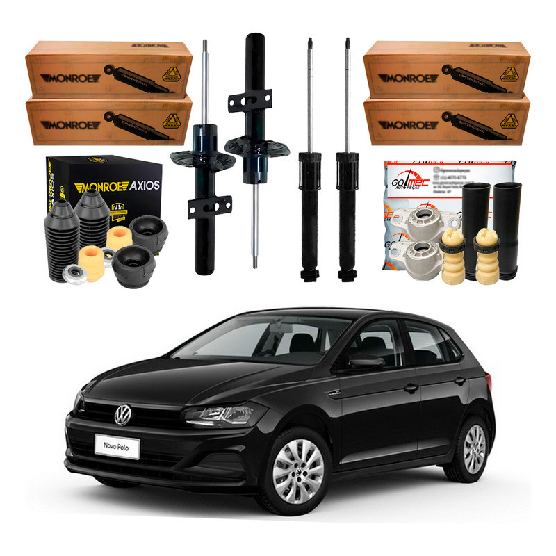 Este anúncio contém os seguintes produtos: Par de amortecedores dianteiros, lado esquerdo e direito; Par de kits amortecedores dianteiros, composto por: coxim, rolamento, batente e coifa; par de amortecedores traseiros, lado esquerdo e direito; par de kits amortecedores traseiros composto de: coxim, batente e coifa. Fabricante dos amortecedores dianteiros: Monroe Fabricante dos kits amortecedores dianteiros: Axios Fabricante dos amortecedores traseiros: Monroe Fabricante dos kits amortecedores traseiros: Go Mec Produtos novos, com 2 anos de garantia para os amortecedores e 3 meses para os kits. Este produto se aplica a esses veículos: Veiculo: Polo; Motores: 1.0, 1.6; Anos de fabricação: 2017, 2018, 2019, 2020, 2021, 2022, 2023; Observações: Não serve no Polo Track. Veiculo: Polo; Motores: 1.0 TSI; Anos de fabricação: 2017, 2018, 2019, 2020, 2021, 2022, 2023; Veiculo: Polo GTS; Motores: 1.4; Anos de fabricação: 2020, 2021, 2022; Veiculo: Virtus; Motores: 1.6 MSI; Anos de fabricação: 2018, 2019, 2020, 2021, 2022; Veiculo: Virtus; Motores: 1.0 TSI; Anos de fabricação: 2018, 2019, 2020, 2021, 2022, 2023; Veiculo: Virtus GTS; Motores: 1.4; Anos de fabricação: 2020, 2021, 2022; Somos a Go! Mec Auto Peças, estamos no ramo de autopeças para veículos nacionais e importados há duas décadas, nosso estoque conta com uma variedade de aproximadamente 45.000 itens. Nossa equipe de Pós-Vendas é altamente capacitada, resultando na excelência no atendimento e na busca constante pela satisfação dos clientes. Navegue pela loja virtual e fique à vontade!