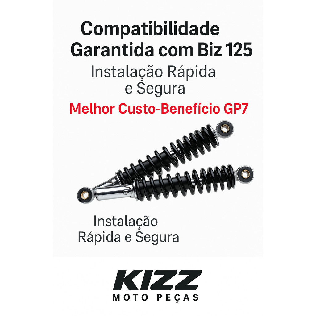 Amortecedor GP7 – Par para Biz 125 – Aderência Ideal, Segurança e Durabilidade Performance equilibrada para sua scooterPara quem busca segurança e conforto no dia a dia, o par de amortecedores GP7 é a opção ideal. Desenvolvidos especialmente para a Honda Biz 125, estes amortecedores trabalham em conjunto para melhorar a aderência ao solo, absorver impactos e reduzir vibrações. O resultado é uma pilotagem mais estável, com maior controle nas curvas e frenagens, mesmo em pisos irregulares. Compatibilidade Honda Biz 125 – todos os anos Honda Biz 100 – todos os anos Honda POP 100 – todos os anos Honda Biz 125 – todos os anos Especificações técnicas Par de amortecedores traseiros com mola helicoidal de aço de alta resistência. Regulagem de pré‑carga da mola (em algumas versões) para ajuste conforme peso e uso. Haste cromada com vedação reforçada para evitar vazamentos. Sistema de amortecimento interno calibrado para uso urbano e rodoviário. Instalação plug‑and‑play no conjunto original da Biz 125. Benefícios para sua moto Aderência ideal ao solo: mantém a roda em contato constante com o pavimento, oferecendo mais tração. Alta segurança: melhora a estabilidade e reduz o balanço em curvas e frenagens. Durabilidade superior: materiais de qualidade e engenharia robusta garantem longa vida útil. Conforto e controle: suavizam impactos e vibrações, tornando a pilotagem mais agradável. Praticidade: par pronto para instalar, sem necessidade de adaptações. Por que comprar na Kizz Moto Peças? Produtos novos e originais, com garantia de fábrica. Envio rápido para todo o Brasil. Atendimento especializado para tirar dúvidas e orientar na escolha. Loja com reputação sólida e milhares de clientes satisfeitos. Imagens meramente ilustrativas