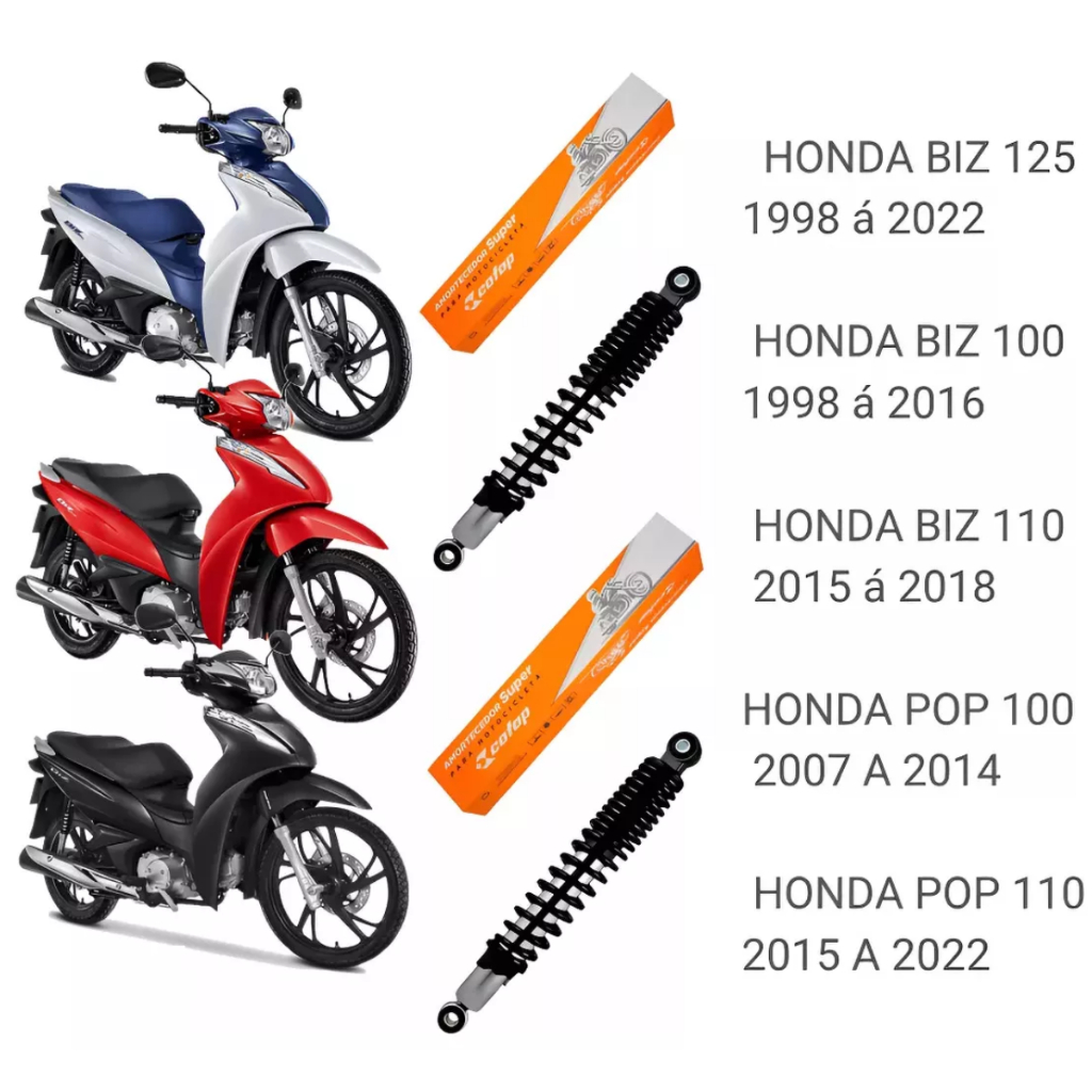 Este anúncio contém: 01 (um) Amortecedor Cofap; Atenção: O Anúncio contém fotos reais do produto. Acompanha Certificado de garantia e nota fiscal. Obs: A garantia do produto só será feita, mediante a apresentação do certificado de garantia, que vai com o produto, corretamente preenchido pelo cliente. Garantia de fábrica: 6 meses. Código: CR22535M; Aplicação: Montadora: Honda; Veículo: Biz 125; Ano de aplicação: 1998, 1999, 2000, 2001, 2002, 2003, 2004, 2005, 2006, 2007, 2008, 2009, 2010, 2011, 2012, 2013, 2014, 2015, 2016, 2017, 2018, 2019, 2020, 2021, 2022. Montadora: Honda; Veículo: Biz 125 ES/EX/KS; Ano de aplicação: 2005, 2006, 2007, 2008, 2009, 2010, 2011, 2012, 2013, 2014, 2015. Montadora: Honda; Veículo: Biz C100; Ano de aplicação: 1998, 1999, 2000, 2001, 2002, 2003, 2004, 2005. Montadora: Honda; Veículo: Pop 100; Ano de aplicação: 2007, 2008, 2009, 2010, 2011, 2012, 2013, 2014, 2015. Montadora: Honda; Veículo: Pop 110; Ano de aplicação: 2015, 2016, 2017, 2018, 2019, 2020, 2021, 2022. Dúvidas frequentes: - O Produto é novo? Sim. Nós trabalhamos apenas com produtos novos, e com garantia. - O Produto é original? Sim. Nós só trabalhamos com distribuidores homologados pelo fabricante. - O produto é igual ao da foto? Sim. Todas as fotos são fieis ao que você receberá. - Em quanto tempo recebo minha compra? É muito simples, basta colocar seu CEP no calculador de frete do anúncio. - Como faço para saber se o produto deste anúncio se aplica ao meu veículo? Na descrição do anúncio você encontra todas as informações das aplicações corretas, se a informação que precisa não está na descrição do anúncio, deixe sua pergunta que nossa equipe de especialistas está preparada para solucionar qualquer dúvida. - Tem alguma dúvida sobre o produto ou sobre a compra? Deixe sua pergunta abaixo, que responderemos prontamente. Atendimento: Nosso horário de atendimento é: 24 horas Temos uma Equipe de Atendimento e Suporte Técnico à disposição. Após a compra, caso tenha alguma dúvida ou algum problema com o seu produto, entre em contato conosco utilizando os canais informados pelas mensagens de pós-venda ou pelo próprio chat de atendimento. • O cumprimento do prazo de entrega é de total responsabilidade da Transportadora e esse prazo é informado no momento da compra podendo ser alterado por condições logísticas. Importante: • Somos Loja Oficial Shopee; • Todos os nossos produtos são checados e bem embalados antes da expedição. • Recomendamos sempre que toda e qualquer instalação seja realizada por profissionais especializados para evitar problemas futuros, pois não somos responsáveis pela má instalação ou mau uso do produto. • Confira se os dados cadastrais estão atualizados, principalmente se o endereço de entrega está correto para evitar que o seu produto retorne e mantenha o número de contato atualizado para que possamos entrar em contato caso necessário. Quem somos: Somos uma empresa, localizada no Rio de Janeiro, com mais de 50 anos de mercado no segmento de atacado e distribuição de Auto Parts em geral. Hoje, a Rhino conta com mais de 10.000 produtos em seu portfólio nos segmentos de refrigeração automotiva, arrefecimento automotivo, suspensão automotiva, mecânica em geral, moto parts e acessórios automotivos. RHINO AUTOPARTS - O Maior E-commerce de Autopeças e Acessórios Automotivos do Brasil.