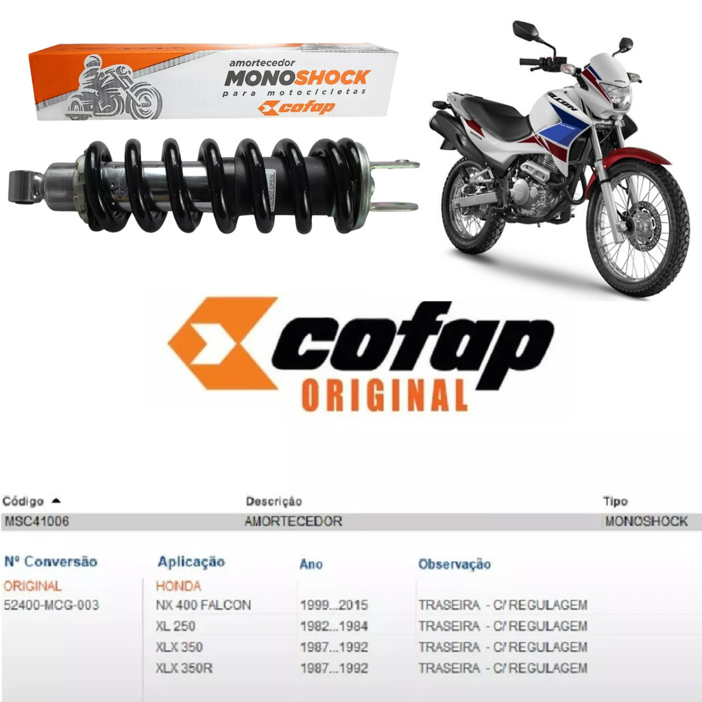 Este anúncio contém: 01 Amortecedor Monoshock Traseiro. Marca: Cofap; Garantia: 6 Meses; Código: MSC41006. Aplicação: Montadora: Honda: Modelo Nx Falcon 400; Ano: 1999, 2000, 2001, 2002, 2003, 2004, 2005, 2006, 2007, 2008, 2012, 2013, 2014, 2015. Montadora: Honda: Modelo XLX 350, XLX 350R; Ano: 1987, 1988, 1989, 1990, 1991, 1992. Montadora: Honda: Modelo XL 250; Ano: 1982, 1983, 1984. Dúvidas frequentes: - O Produto é novo? Sim. Nós trabalhamos apenas com produtos novos, e com garantia. - O Produto é original? Sim. Nós só trabalhamos com distribuidores homologados pelo fabricante. - O produto é igual ao da foto? Sim. Todas as fotos são fiéis ao que você receberá. - Em quanto tempo recebo minha compra? É muito simples, basta colocar seu CEP no calculador de frete do anúncio. - Como faço para saber se o produto deste anúncio se aplica ao meu veículo? Na descrição do anúncio você encontra todas as informações das aplicações corretas, se a informação que precisa não está na descrição do anúncio, deixe sua pergunta que nossa equipe de especialistas está preparada para solucionar qualquer dúvida. - Tem alguma dúvida sobre o produto ou sobre a compra? Deixe sua pergunta abaixo, que responderemos prontamente. Atendimento: Nosso horário de atendimento é: 24 horas Temos uma Equipe de Atendimento e Suporte Técnico à disposição. Após a compra, caso tenha alguma dúvida ou algum problema com o seu produto, entre em contato conosco utilizando os canais informados pelas mensagens de pós venda ou pelo próprio chat de atendimento. Envios e prazos: * Nossos envios são realizados com no máximo 24hs úteis após a confirmação do pagamento. Lembrando que, existe um prazo de aprovação diferenciado para pedidos com pagamento realizado em boleto bancário; * O cumprimento do prazo de entrega é de total responsabilidade da Transportadora e esse prazo é informado no momento da compra podendo ser alterado por condições logísticas. Importante: * Todos os nossos produtos são checados e bem embalados antes da expedição. * Recomendamos sempre que toda e qualquer instalação seja realizada por profissionais especializados para evitar problemas futuros, pois não somos responsáveis pela má instalação ou mau uso do produto. * Confira se os dados cadastrais estão atualizados principalmente se o endereço de entrega está correto para evitar que o seu produto retorne e mantenha o número de contato atualizado para que possamos entrar em contato caso necessário. Quem somos: Somos uma empresa, localizada no Rio de Janeiro, com mais de 50 anos de mercado no segmento de atacado e distribuição de Auto Parts em geral. Hoje, a Rhino conta com mais de 10.000 produtos em seu portfólio nos segmentos de refrigeração automotiva, arrefecimento automotivo, suspensão automotiva, mecânica em geral, moto parts e acessórios automotivos. RHINO AUTOPARTS - O Maior E-commerce de Autopeças e acessórios automotivos do Brasil