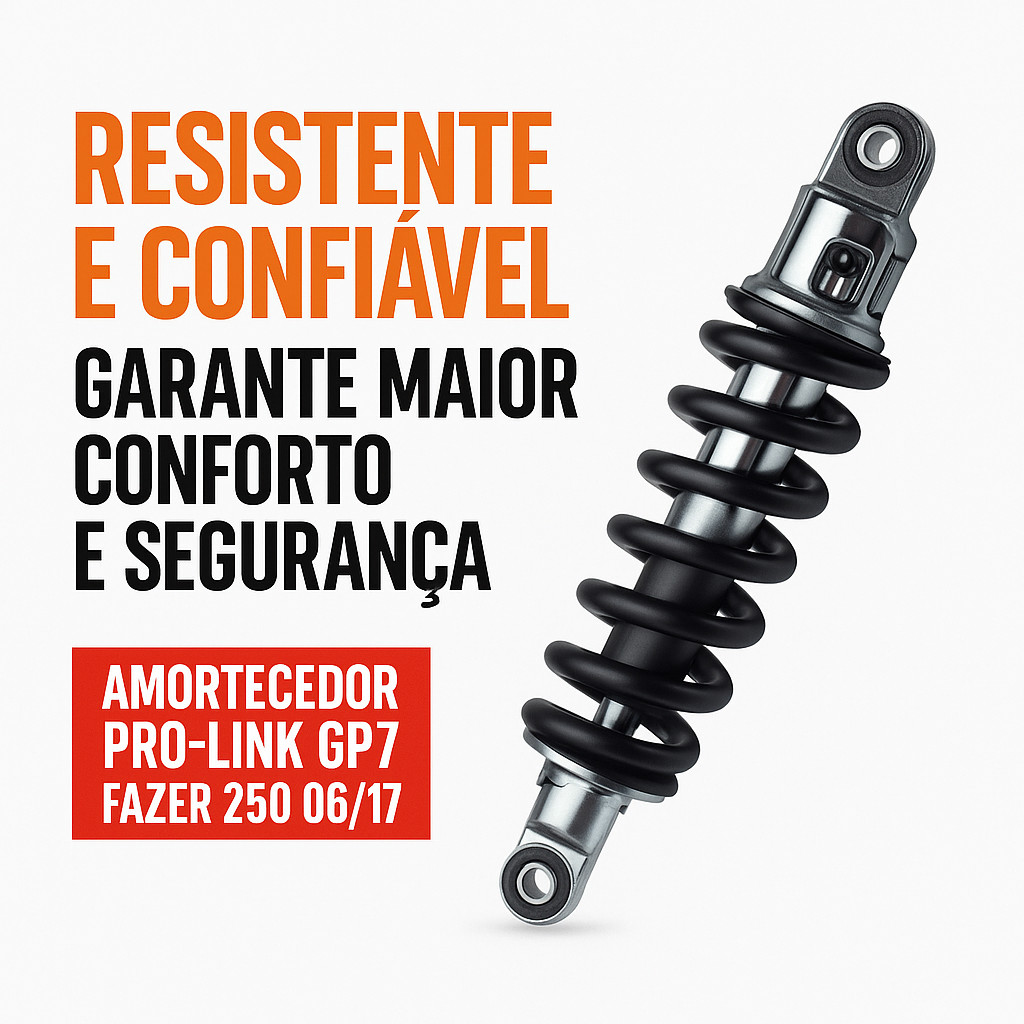 O Amortecedor Pro-Link GP7 para Yamaha Fazer 250 (2006 a 2017) foi desenvolvido para oferecer aderência ideal do pneu ao solo, garantindo muito mais segurança e estabilidade durante a pilotagem. Produzido em material de alta resistência, ele absorve impactos com eficiência e melhora o desempenho da moto em diferentes condições de uso, seja no dia a dia ou em viagens mais longas. Com sistema Pro-Link, este amortecedor proporciona uma suspensão traseira progressiva, que se adapta ao peso e ao terreno, entregando conforto superior, maior durabilidade e melhor controle da motocicleta. Benefícios Aderência ideal do pneu ao solo Maior estabilidade em curvas e frenagens Absorção eficiente de impactos e vibrações Sistema Pro-Link com progressividade e conforto Construção robusta para longa vida útil Compatibilidade Compatível com os seguintes modelos Yamaha: Fazer 250 (2006 a 2017) (Antes da compra, confirme a compatibilidade no manual da moto ou com seu mecânico de confiança.) Informações Importantes para o Cliente Produto novo e de alta qualidade, com encaixe perfeito para os modelos indicados. A Kizz Moto Peças garante envio rápido, bem embalado e seguro para todo o Brasil. Além disso, nossa equipe está disponível para auxiliar antes e depois da compra, garantindo que você tenha a melhor experiência. Motivos para Comprar na Kizz Moto Peças Loja especializada em motopeças com experiência comprovada Produtos de marcas confiáveis como GP7, Texx e Darom Envio rápido e seguro Atendimento personalizado e suporte especializado Excelente custo-benefício aliado à qualidade garantida Garanta já o Amortecedor Pro-Link GP7 para Fazer 250 2006 a 2017 e experimente mais segurança, desempenho e conforto em cada quilômetro. Imagens Meramente Ilustrativas