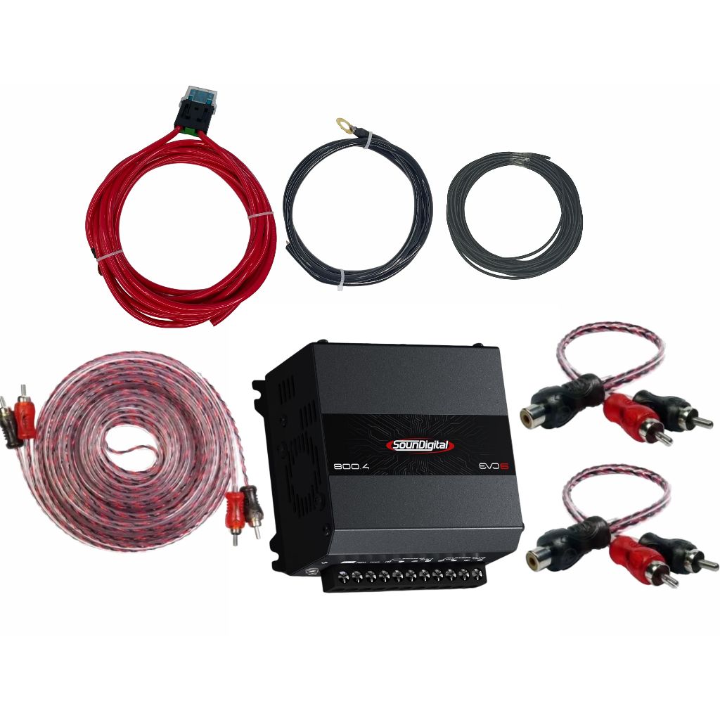 Descrição A CARSOUND RS é uma empresa com 19 anos de tradição na venda de autopeças e eletrônicos. Nossa principal missão é trazer a qualidade de nossos produtos com um preço incrível, qualidade no atendimento e uma negociação confiável. Amplificador SD 800.4 + Kit de instalação para amplificador até 800w RMS Conteúdo da embalagem - 1 Amplificador SounDigital 800.4 EVO6 - 4 canais 800w RMS - 1 Cabo positivo 6mm² com 5 metros de comprimento, porta-fusível MAX Premium com capa e terminal olhal para fixação na bateria. - 1 Cabo negativo de 6 mm² com 1metro com terminal olhal para fixação ao ponto de terra, - 1 Cabo de remote com 5mts - 1 Cabo RCA com aterramento e ponteiras banhadas a ouro - 2 Cabos Y com ponteiras banhadas a ouro - 1 Fusível MAX de 40 A Sobre o amplificador Soundigital 800.4 EVO6 4 Canais de 200w RMS á 2 ohms 4 Ohms quando ligado em Bridge Crossover Passa baixa e Passa Alta Dimensão de 5,1 cm x 11 cm x 11 cm Peso 0,6kg Carcaça de aluminio Bateria recomendada - Minimo de 40A Obs.: - O cabo ngativo poderá ser da cor azul ou preto, conforme a disponibilidade do estoque - O Cabo RCA poderá ser cristal ou azul, conforme a disponibilidade de estoque. Essas alterações sedão apenas em cores. Será mantida a qualidade dos itens. Perguntas O kit de cabos serve para o meu amplificador? - Sim, o kit é universal para qualquer amplificador até 800w RMS, com até 4 canais com entradas RCA. Tem tudo que eu preciso para ligar meu amplidicador? - O kit contempla todos os fios para instalar a entrada de audio e a alimentação do amplificador. Se o carro não tiver a fiação dos alto falantes, pode ser necessario adicionar estes fios. Consulte nossos produtos para kits com configuração diferentes que podema atender essa situação. -Como é definido o diâmetro dos fios? Os fios tem as medidas de diâmetro expressas no anuncio em milimetros quadrados Qual o prazo de envio? - Até 1 dia útil. Quando meus produtos chegarão? - No anuncio, logo abaixo do preço, estará a data prevista para entrega. Verifique antes de fazer a compra. Como rastreio meu pedido? - Dentra do link "Minhas compras", clique na compra que quer consultar e depois em detalhes do envio. Obrigado CarSoundRS