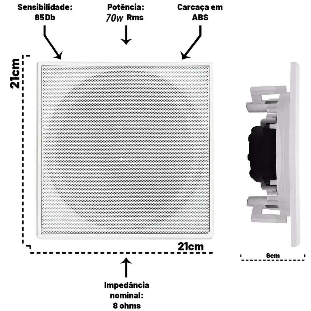 Mais de 15 anos de experiencia no mercado com os melhores produtos e o melhor atendimento! 1 Amplificador Bluetooth e 4 Caixas de teto Embutir Arandela 70W Compativel com ALEXA e GOOGLE ASSISTENTE Solucao moderna e eficiente para a reproducao de musica sem fio, o amplificador Bluetooth para som ambiente foi desenvolvido para ficar oculto na caixa de som. Com ele, voce reduz a quantidade de fios da sua instalacao e pode se conectar ao smartphone de forma simples, pratica e segura. Depois, e so se divertir ouvindo as musicas armazenadas no seu celular ou simplesmente reproduzindo suas playlists favoritas em qualquer servico de audio. O AMPLIFICADOR VAI INSTALADO NA ARANDELA, PRONTO PARA USAR Conta com uma arandela ativa de 70W Rms e uma passiva, podendo ser instalada em forro de drywall, gesso, madeira , pvc, possui garras para fixacao ajustaveis. A arandela ativa e ligada a energia por fonte bivolt e e controlada pelo Bluetooth que estiver conectado a ela As arandelas passivas sao ligadas na ativa por meio de fio paralelo (nao incluso), as passivas nao necessitam ser ligadas na energia. Caracteristicas tecnicas da Arandela ativa: - Alto Falante: 6 polegadas - Tweeter coaxial com piezo duplo - Potencia Nominal: 70W Rms - Faixa de Frequencia: 100 - 20kHz - Impedancia: 8 Ohms - Alto falante mid bass com borda de espuma - Dimensoes: 21 cm x 21 cm - Cor: Branca Caracteristicas tecnicas da Arandela passiva: - Alto Falante: 6 polegadas - Potencia Nominal: 70W Rms - Tweeter coaxial com piezo duplo - Faixa de Frequencia: 100 - 20kHz - Impedancia: 8 Ohms - Dimensoes: 21 cm x 21 cm - Cor: Branca Conteudo da embalagem: - 1 Arandela Quadrada Ativa - 3 Arandela Quadrada Passiva - 1 Fonte de alimentacao Bivolt - Kits de suportes de fixacao - 1 Manual Recomendamos que a instalacao seja feita por um profissional.