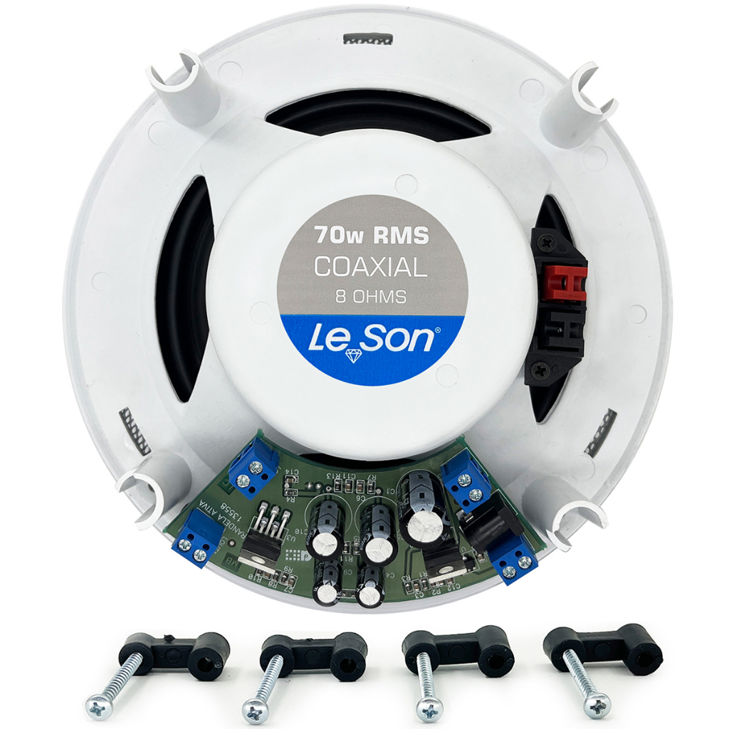 Mais de 15 anos de experiencia no mercado com os melhores produtos e o melhor atendimento! Amplificador Bluetooth + 4 Caixas de teto Embutir Arandela 70W Compativel com ALEXA e GOOGLE ASSISTENTE Solucao moderna e eficiente para a reproducao de musica sem fio, o amplificador Bluetooth para som ambiente foi desenvolvido para ficar oculto na caixa de som. Com ele, voce reduz a quantidade de fios da sua instalacao e pode se conectar ao smartphone de forma simples, pratica e segura. Depois, e so se divertir ouvindo as musicas armazenadas no seu celular ou simplesmente reproduzindo suas playlists favoritas em qualquer servico de audio. O AMPLIFICADOR VAI INSTALADO NA ARANDELA, PRONTO PARA USAR Conta com uma arandela ativa de 70W Rms e uma passiva, podendo ser instalada em forro de drywall, gesso, madeira , pvc, possui garras para fixacao ajustaveis. A arandela ativa e ligada a energia por fonte bivolt e e controlada pelo Bluetooth que estiver conectado a ela A arandela passiva e ligada na ativa por meio de fio paralelo (nao incluso), a passiva nao necessita ser ligada a energia Caracteristicas tecnicas da Arandela ativa: Alto Falante: 6 polegadas Tweeter coaxial com piezo duplo Potencia Nominal: 70W Rms Faixa de Frequencia: 100 Hz - 20kHz Impedancia: 8 Ohms Alto falante mid bass com borda de borracha Dimensoes: 6x19,5x19,5 cm Cor: Branca Caracteristicas tecnicas da Arandela passiva: Alto Falante: 6 polegadas Potencia Nominal: 70W Rms Faixa de Frequencia: 100 - 20kHz Impedancia: 8 Ohms Dimensoes: 6x19,5x19,5 cm Cor: Branca Conteudo da embalagem: 1 Arandelas Redonda Ativa 1 Fonte Bivolt 110v/220v 3 Arandela redonda branca passiva Kits de suporte para fixacao