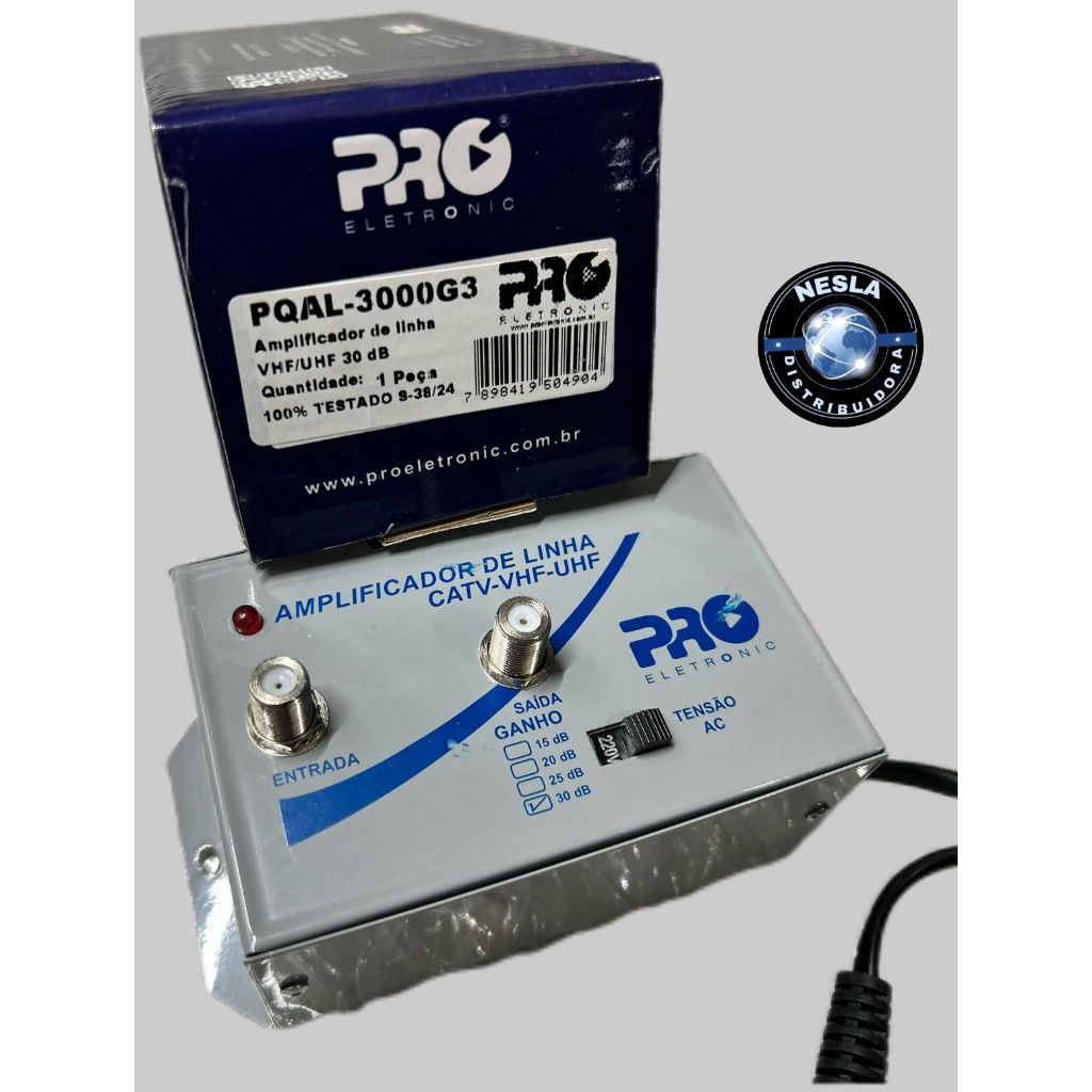✅ Indicado para residências e apartamentos que necessitam melhorar a qualidade da imagem dos canais de tv ! 🔹Compacto e com baixo consumo com amplificador de Linha Proeletronic é possível dividir o sinal de TV sem perda de qualidade. Produzido no Brasil, este amplificador compensa as perdas impostas pela utilização de cabos coaxiais e divisores na instalação. Sua caixa metálica é revestida com pintura eletroestática, garantindo maior proteção e resistência do produto. MATERIAL: Caixa metálica com pintura eletrostática, garantindo durabilidade e proteção. ESPECIFICAÇÕES - Ganho 30 dB; - Bivolt; - 100% testado; - Garantia de fábrica - Produto fabricado no Brasil DIMENSÕES: 135 × 70 x 38 mm PESO: 356 g ⚠️ Principais Características: Marca: Pro eletronic Modelo: PQAL-3000 ✅ PRODUTO ORIGINAL ✅ PRODUTO COM NOTA FISCAL 📫Envio rápido e seguro! 💬 Qualquer dúvida, estamos à disposição no chat!