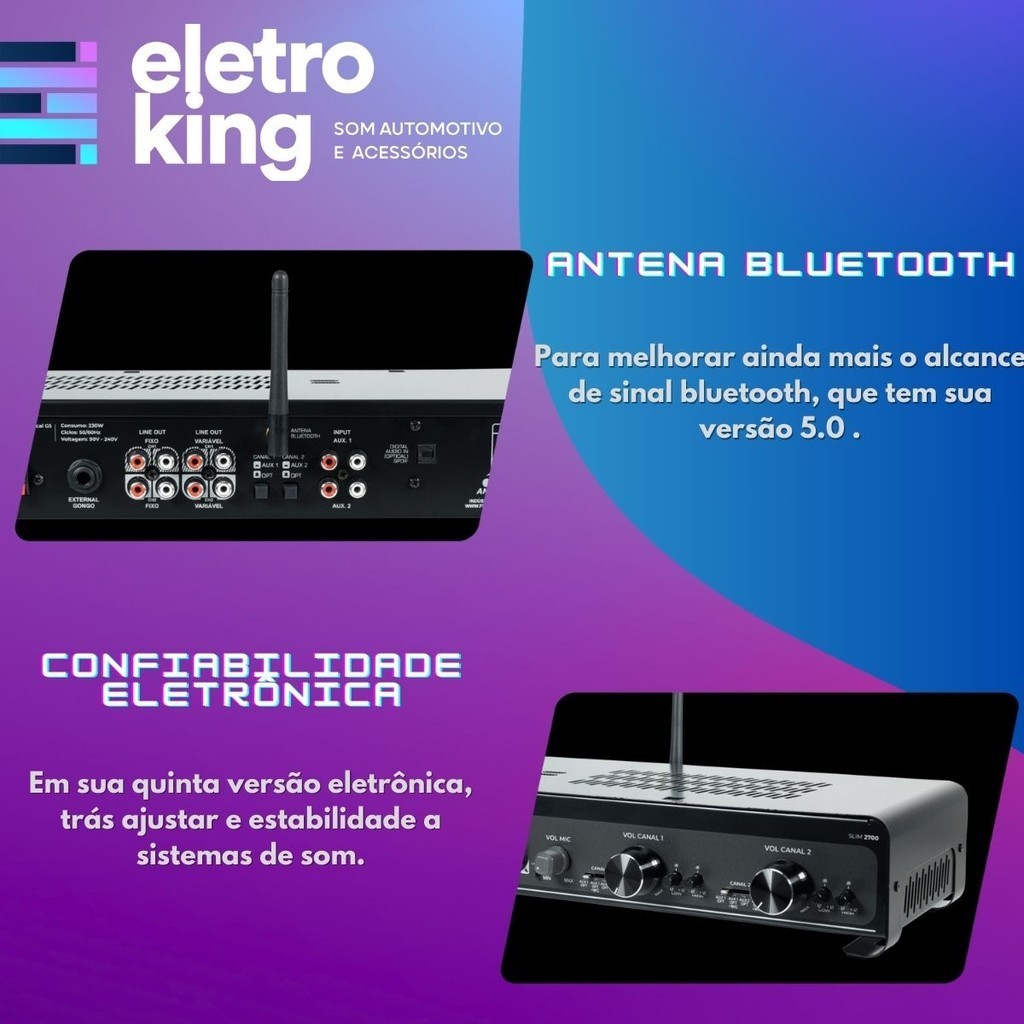 Seja bem-vindo à eletroking, leia atentamente a descrição do produto abaixo antes da compra, qualquer dúvida, nos acione no campo de perguntas do anúncio. Amplificador Frahm Slim 2700 Optical G5 BT/USB/SD/AUX 160 Watts Rms 2 Canais 4 Ohms - Bivolt Conheça o Amplificador Slim 2700 Optical G5, projetado para sonorizar dois ambientes distintos com músicas diferentes, graças aos seus dois canais independentes, cada um com controle de volume e equalizadores separados. Agora na quinta geração (G5), este amplificador combina tecnologia avançada com um visual único e inovador. Esta geração mantém toda a confiabilidade sem perder sua essência característica. Especificações Técnicas: Amplificador Frahm Slim 2700 Optical G5 160 Watts Rms 2 Canais 4 Ohms - Bivolt • Potência: 160W RMS (2x 80W) @ 4 Ohms • Amplificador: Classe AB • Número de canais saída: 2 canais • Conexões de entrada 1: USB / FM / MicroSD / Óptico / BT / P2 • Conexões de entrada 2: Entrada auxiliar 2x (RCA) • Conexões para MIC: 1x (p10) • Sensibilidade do AUX 1: 2x220m VRMS @ 1KHz • Sensibilidade do AUX 2: 2x250m VRMS 1KHz • Sensibilidade do MIC: 14m VRMS @ 1KHz • Impedância do AUX 1: 8K Ohms • Impedância do AUX 2: 40K Ohms • Bivolt automático: 90-240V • Consumo máximo: 230W • Dimensões (AxLxP): 63x385x165mm • Peso: 2 Kg Conteúdo da Embalagem: • 01 Amplificador Slim 2700 Optical G5 • 01 Controle remoto para o dispositivo • 01 Antena Bluetooth • 02 Pilhas AAA • 01 Manual de instruções Importante: • Garantia de 182 Dias • Valor da unidade • Todos os Nossos Produtos São Novos, Originais e Acompanham Nota Fiscal. • A eletroking recomenda que a instalação seja feita por profissional especializado e não se responsabiliza pelo mau uso do produto.
