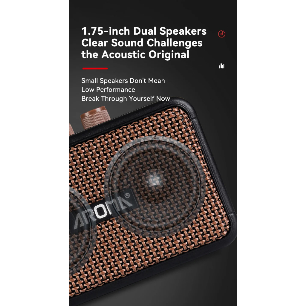 Alimentado por uma bateria de lítio recarregável de alta capacidade Use o cabo USB tipo C para recarregar Alto-falante duplo de 5 watts, amplificador analógico Efeitos de alta qualidade como clean e overdrive Use o Bluetooth para reproduzir músicas do seu celular ESPECIFICAÇÕES Pico de saída: 5W Alto-falante: 1,75 polegadas de alcance totalx2 Versão do Bluetooth: 5.0 Fonte de alimentação: Bateria de lítio de 3,7V/2200mAL Tempo de carregamento total: 3 horas Hora de trabalho após a recarga completa: 7 horas Dimension:125x65x88mm Peso: 363g Itens inclusos: Cabo USB tipo C, manual do proprietário COMO USAR Etapas simples para conectar e começar a curtir a reprodução de música. 1. Diminua o volume principal (VOLUME) para o mínimo. 2. Conecte sua guitarra ao conector de entrada (INPUT) no painel lateral. 3. Pressione e mantenha pressionado o botão de energia (POWER) para ligá-lo. 4. Gire o botão de volume no sentido horário até a posição apropriada, ajuste o ganho e o tom e obtenha o som desejado.