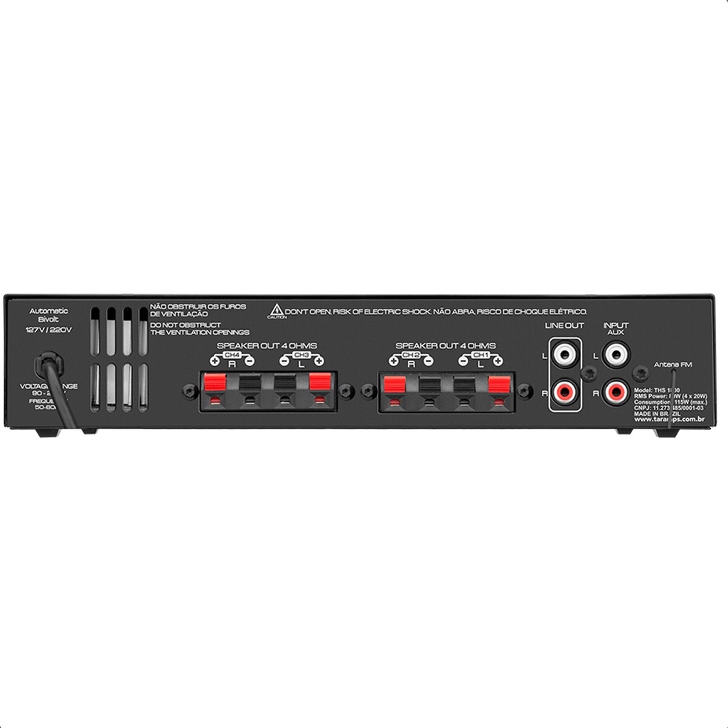 CARACTERÍSTICAS DO PRODUTO: TARAMPS THS: Receiver Multi Channel Classe AB NÚMEROS DE CANAIS: 04 POTÊNCIA RMS: 80W POTÊNCIA RMS NOMINAL DE CADA CANAL: 20W ENTRADAS: Bluetooth, USB, MicroSD, Radio FM, AUX frontal e traseira e RCA traseira TENSÃO DE SAÍDA RMS NOMINAL DE CADA CANAL: 8,95 Vrms DISTORÇÃO HARMÔNICA TOTAL + RUÍDO (THD + N) NA POTÊNCIA NOMINAL DE CADA CANAL (125W): 4% IMPEDÂNCIA NOMINAL DE CADA CANAL: 4 Ohms SENSIBILIDADE DAS ENTRADAS AUX: 200 mV IMPEDÂNCIA DAS ENTRADAS AUX: 2,2K Ohms RESPOSTA EM FREQUÊNCIA (EQUALIZADORES EM 0DB): 20Hz to 20KHz (-3dB) ATUAÇÃO TÍPICA DO EQUALIZADOR DE 3 VIAS Low (graves): 12dB - 80Hz Mid (médios): 12dB - 2KHz High (agudos): 12dB - 10KHz RELAÇÃO SINAL RUÍDO: 70dB SISTEMA DE PROTEÇÕES: Proteção nas saídas contra curto e sobreaquecimento. ALIMENTAÇÃO: 90 a 240V AC (automático) 50/60Hz CONSUMO STAND BY: 1,4W CONSUMO MÁXIMO: 115W FUSÍVEL DE PROTEÇÃO INTERNO: 3A FAIXA DE FREQUÊNCIAS FM 87,5 MHz a 108MHz DIMENSÕES: 269 x 59 x 142mm IMPORTANTE: A Loja do Som e Acessórios recomenda que a instalação seja feita por profissional especializado e não se responsabiliza pelo mau uso do produto.