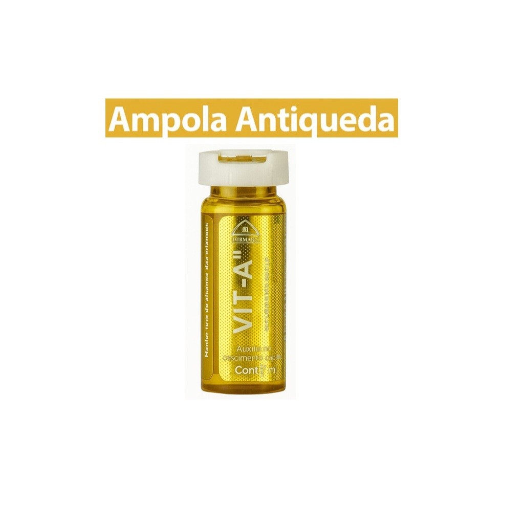 Kit contendo 12 ampolas de Vitamina A A deficiência dessa vitamina é agravante para a queda de cabelo, por isso, sua reposição ajuda a reduzir o problema. Proporciona a ativação das células que produzem melanina, pigmento que dá cor aos cabelos, além de conferir brilho e maciez, pela ação de óleo naturais, ricos em vitamina A. Como usar: Cada embalagem de nosso produto consiste em uma dose única ,usando-se um a cada aplicação. Uso diário. 1 por dia. A aplicação pode ser feita diariamente, preferencialmente após o banho, com os cabelos ainda umedecidos e sem enxágua-los, devendo-se sempre estar massageando os fios, Conteúdo: 12 ampolas de 2,8 ml Validade: 2 anos ------------------------------------------------------------------------------------------------------------------------------------------------------------------------------------ A DERMABEL, empresa com 55 ANOS no mercado Cosmético busca sempre as melhores experiências e lançamentos. Priorizamos SEMPRE, a qualidade e originalidade dos nossos produtos. ✅PRONTA ENTREGA E ENVIO IMEDIATO ✅ENVIO EM ATÉ 6 HORAS ÚTEIS ✅ ENVIAMOS PARA TODO BRASIL -✅DIRETO DE FÁBRICA COM NOTA FISCAL