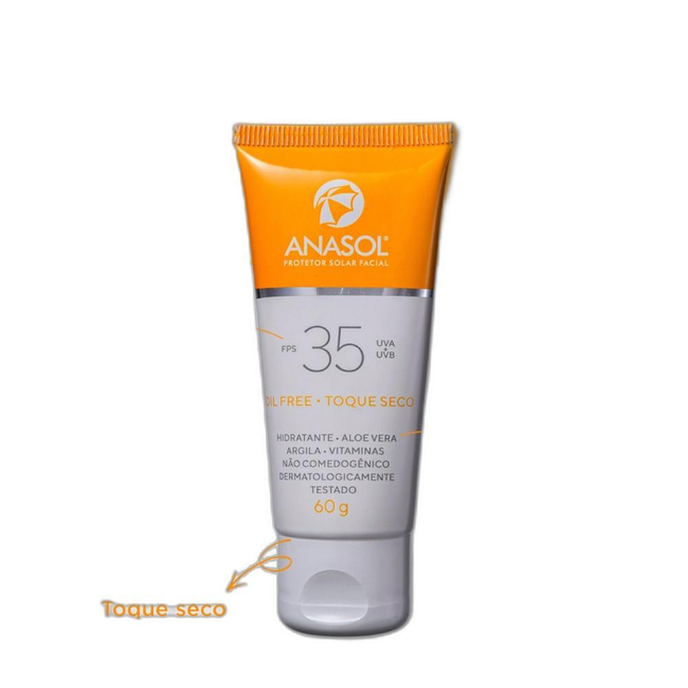 Protetor solar facial para todos os tipos de pele. Com fórmula oil free de toque seco, Anasol Facial FPS 35 protege do sol e possui ação hidratante e antioxidante. O Protetor Solar Facial Anasol FPS 35 contém argila que reduz a oleosidade para resultado de efeito matte. Ajuda a prevenir queimaduras solares causadas por raios UVB, assim como manchas e rugas causadas por raios UVA. **** IMPORTANTE: Não vendemos para contas CNPJ, evite que seu pedido seja cancelado! ****
