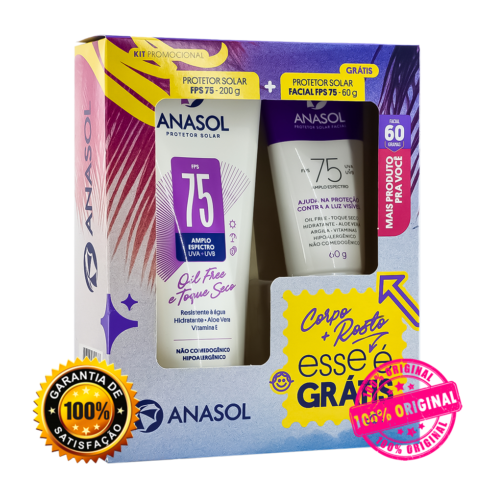 Anasol Protetor Solar Facial FPS 75 + Protetor Solar Corporal FPS 75 (Rosto sequinho e corpo hidratado. Alta proteção.) 1. Proteção solar de amplo espectro com potente ação antioxidante. O Protetor Solar FPS 75, é desenvolvido com filtros solares avançados que proporcionam proteção solar de amplo espectro, protegendo a pele não apenas contra as radiações solares, mas também contra a luz visível e minimizando os danos causados pelos raios infravermelhos (IV). Fórmula enriquecida com Argila Orgânica, Aloe Vera e Pantenol, oferecendo controle eficaz de oleosidade e potente ação antioxidante e hidratante para a pele. Produto resistente à água, dermatologicamente testado, não comedogênico, hipoalergênico, formulado de maneira a minimizar o possível surgimento de alergia. Quais os diferenciais do produto - FPS 75 - Amplo Espectro: UVA, UVB, luz visível e raios infravermelhos. - Minimiza os danos mais profundos na pele causados pelos raios infravermelhos, devido à ação antioxidante do produto. Clareia e uniformiza a pele. - Promove efeito matte e toque seco. Possui argila orgânica que auxilia no controle da oleosidade e repõe minerais à pele. - Vitamina E, Aloe Vera e Pantenol com ação hidratante e antioxidante. Resistente à água, dermatologicamente testado, hipoalergênico, não comedogênico e oil free 2. Loção corporal de toque seco e rápida absorção com altíssima proteção solar! O Protetor Solar Loção FPS 75 oferece dupla proteção contra os raios UVA e UVB, prevenindo o envelhecimento precoce e queimaduras causadas pela exposição ao sol. Sua fórmula também proporciona ação antioxidante e hidratante, cuidando da pele com a presença de Aloe Vera e Vitamina E. Produto dermatologicamente testado. Formulado de maneira a minimizar possível surgimento de alergia. Quais os diferenciais do produto - Proteção de amplo espectro: proteção contra raios UVA/UVB e infravermelhos. Contém Vitamina E com ação antioxidante e Aloe Vera com ação hidratante. - Minimiza os danos mais profundos na pele causados pelos raios infravermelhos devido à ação antioxidante do produto. - Indicado para peles extremamente sensíveis propensas a queimaduras solares. - Dermatologicamente testado, hipoalergênico, não comedogênico e livre de óleo.