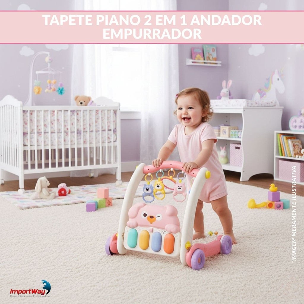 Andador Empurrador Infantil 2 em 1 Tapete Piano Musical Rosa Estimula Primeiros Passos Som e Móbile Certificado Inmetro