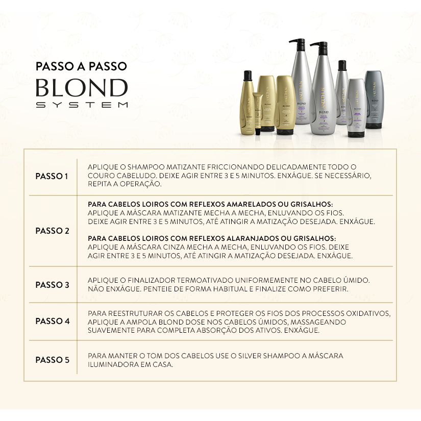 Aneethun Blond System Máscara iluminadora para cabelos loiros e grisalhos. Aneethun Blond System proporciona brilho intenso, fios macios e vibrantes. A Máscara Iluminadora Aneethun Blond System possui uma tecnologia óptica que elimina gradativamente o amarelado dos fios, além de hidratar profundamente o cabelo. Ela age impedindo o ressecamento dos fios e possui um pH é de 4,0, ou seja, é liberada para uso de pessoas que passaram por algum processo de relaxamento ou escova progressiva. Conselho de Aplicação Aplique máscara iluminadora por toda extensão dos fios, massageando suavemente mecha a macha. De uma pausa de 3 a 5 minutos e depois enxague bem. Nossos Experts Ensinam Para garantir que a máscara seja aplicada de maneira uniforme por todo cabelo, divida os fios em mechas ao passar o produto, ou conte com o auxílio de um pente para distribuir por completo. Reflective A: ativo com tecnologia Óptica, que auxilia na neutralização do tom amarelado e proporciona brilho máximo aos fios. Ômega Gold: é um Antioxidante de alta performance combinado com a Vitamina E. Figo: proteína natural que possui nutrientes essenciais para a saúde dos fios. Seu cabelo hidratado, com o tom neutralizado, iluminado e macios.