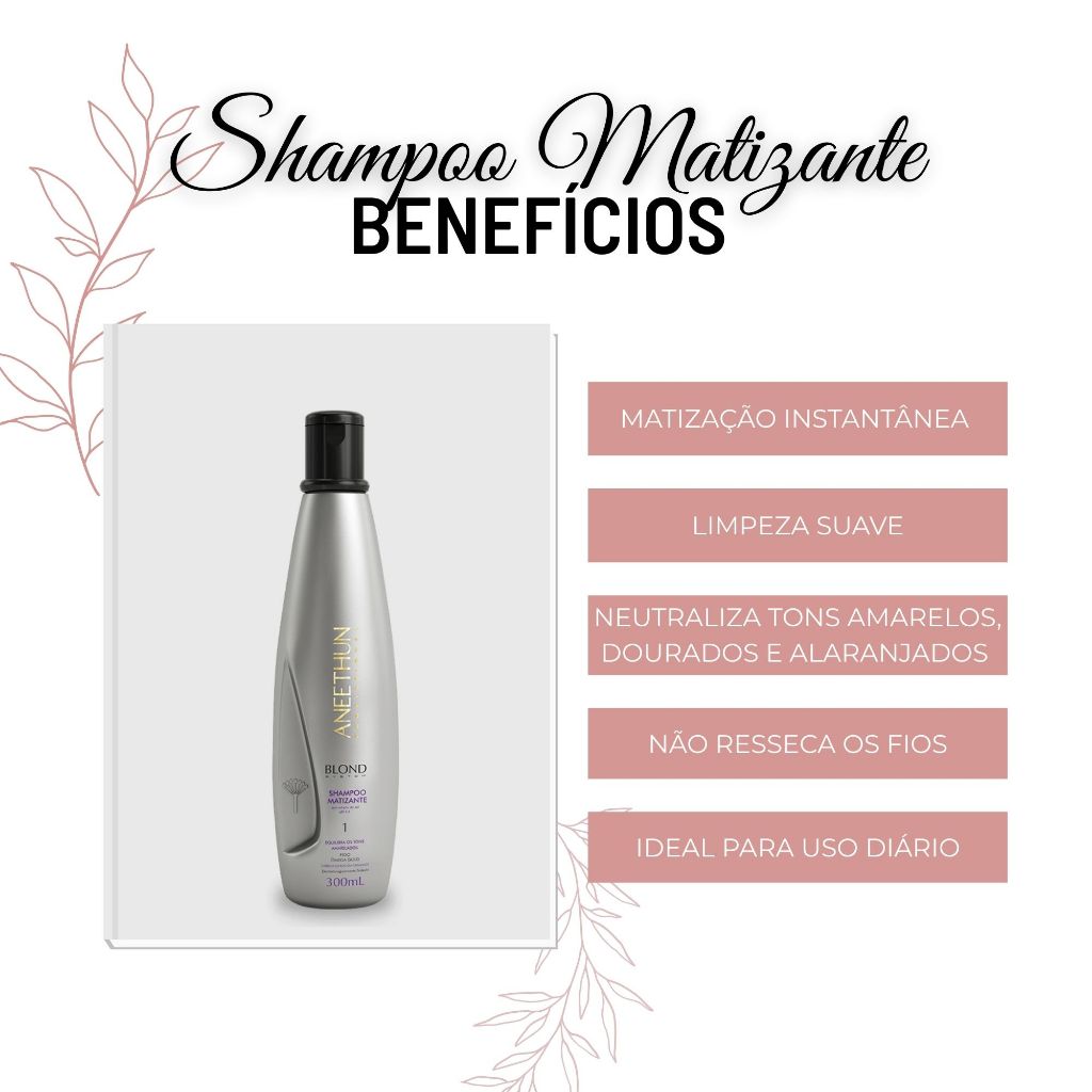 SHAMPOO MATIZANTE BLOND SYSTEM ANEETHUN – MATIZAÇÃO INSTANTÂNEA E BRILHO INTENSO (300ML) Obtenha cabelos loiros ou grisalhos radiantes com limpeza equilibrada, matização eficaz e muito brilho, todos os dias! PRINCIPAIS BENEFÍCIOS • Matização instantânea já na lavagem • Limpeza suave, sem ressecar os fios • Neutraliza tons amarelos, dourados e alaranjados indesejados • Uniformiza a cor e intensifica o tom claro • Brilho extremo desde a primeira aplicação • Ideal para uso diário (linha Home Care) ATIVOS E TECNOLOGIAS EXCLUSIVAS • Acid Violet: neutraliza reflexos dourados e alaranjados, deixando um tom platinado frio • Tecnologia Ótica Reflective A: potencializa a reflexão da luz e intensifica o brilho • Tecnologia Ótica Reflective C: neutraliza ainda mais o amarelamento, realçando a cor dos cabelos INDICAÇÃO • Cabelos loiros, grisalhos ou descoloridos que precisam neutralizar tons indesejados e manter o brilho MODO DE USO • Aplique o shampoo no couro cabeludo, massageando delicadamente • Deixe agir de 3 a 5 minutos • Enxágue e, se necessário, repita a aplicação DIFERENCIAIS • Dermatologicamente testado • Não testado em animais CONTEÚDO DA EMBALAGEM • 01 unidade de Shampoo Matizante Blond System Aneethun – 300ml Garanta a cor perfeita dos seus cabelos, com brilho e saúde em cada lavagem! ✨