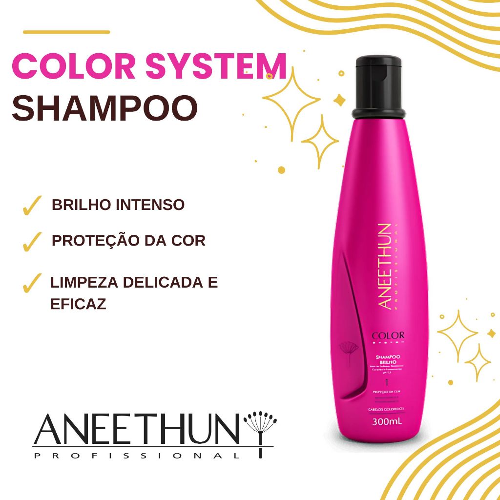 Aneethun Color System – Shampoo + Máscara + Finalizador Brilho e Proteção da Cor 🎁 Promoção Imperdível! Ao levar o kit completo, você ganha uma escova de cabelo de mimo! E tem mais: em compras acima de R$69,90, você ainda recebe +1 mimo surpresa exclusivo! A linha Color System da Aneethun foi desenvolvida especialmente para cabelos coloridos, descoloridos e tonalizados, oferecendo brilho intenso, proteção da cor e ação antioxidante. Seus ativos exclusivos formam um sistema de blindagem que prolonga a durabilidade da coloração e recupera a saúde dos fios. (Atenção: esse kit possui variações) Itens disponíveis no kit (consulte variações): Shampoo Brilho Color System – 300ml Máscara Brilho Color System – 250g Finalizador Brilho Color System – 250g Benefícios: Prolonga a durabilidade da coloração Proteção contra o desbotamento Ação antioxidante e reconstrutora Realce do brilho e maciez Fórmula profissional com alto rendimento Indicação: Ideal para cabelos com coloração, luzes, mechas, tonalizantes ou descoloridos que precisam de proteção, brilho e cuidado diário. Modo de uso: Aplique o shampoo nos cabelos molhados, massageie suavemente e enxágue. Aplique a máscara, deixe agir por alguns minutos e enxágue. Finalize com o finalizador, aplicando nos fios úmidos ou secos. Não enxágue.