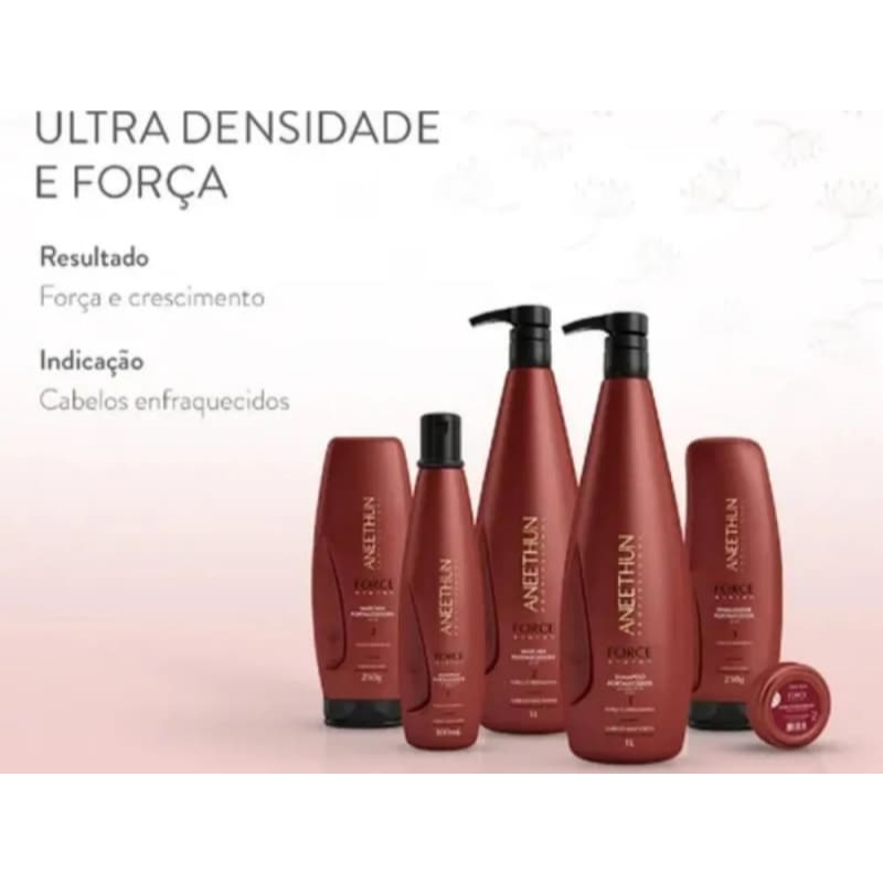 Aneethun Force System Máscara para cabelos enfraquecidos. Aneethun Force System impulsiona o crescimento e proporciona mais força aos fios. A Máscara Fortalecedora Aneethun Force System possui exclusiva tecnologia Densifiber que atua desde o bulbo até o córtex capilar para minimizar a queda, hidratar, nutrir e condicionar profundamente, devolvendo resistência, brilho e vitalidade aos cabelos. Conselho de Aplicação Aplique a Máscara mecha a mecha, enluvando os fios, iniciando na altura da orelha em direção às pontas. Deixe agir por 2 minutos e depois enxágue. Nossos Experts Ensinam Utilize uma touca térmica durante a ação do produto e veja resultados ainda mais potentes! Densifiber: o mecanismo de ação do Densifiber estimula o metabolismo intracelular, eleva os níveis de Trifosfato ATP, melhora a vascularização da derme, impulsionando o crescimento dos fios e evitando a queda. Aminoácidos Vegetais: promovem uma reconstrução profunda do fio danificado, aumentando sua resistência. Cabelo hidratado, fortalecido, brilhoso e com mais vitalidade.