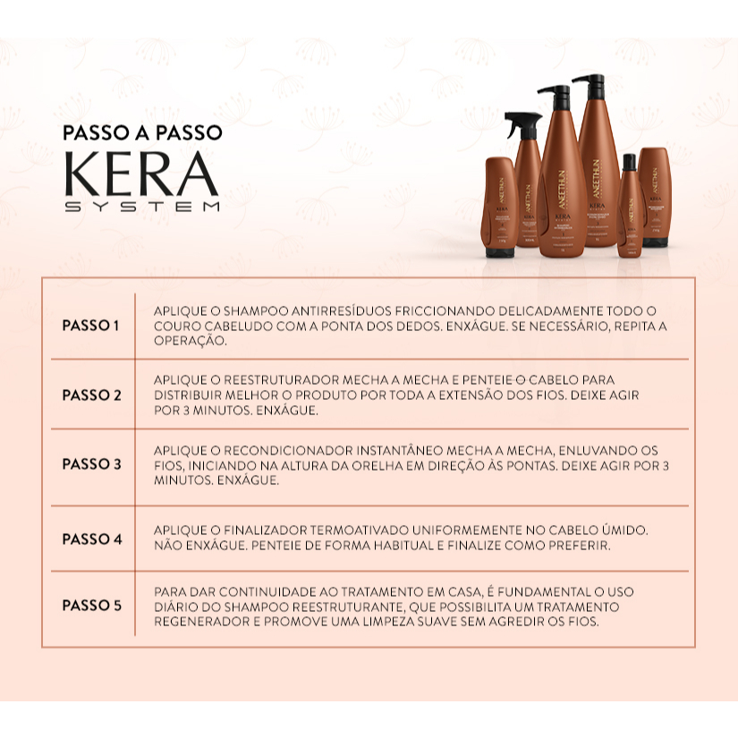 Aneethun Kera System Recondicionador para cabelos danificados. Aneethun Kera System complementa e finaliza o tratamento de reestruturação dos fios. O Recondicionador Instantâneo Aneethun Kera System foi pensado para uso profissional. Sua composição é rica em ativos potentes que selam as cutículas e recuperam a saúde do fio. Resultado imediato no lavatório, proteção termoativada e proteção solar. pH 4,0. Conselho de Aplicação Após lavar o cabelo com o shampoo Kera System, aplique o recondicionador, massageando suavemente da raiz até as pontas. Deixe agir por 2 a 3 minutos. Enxágue abundantemente. Nossos Experts Ensinam Respeite sempre o tempo de pausa indicado pela marca, assim você garante a máxima performance do produto. Vitamina E: possui ação antioxidante, removendo as impurezas da fibra capilar, tais como óleos, cloro, agentes poluentes e resíduos de produtos químicos. Queratina Hidrolisada e Ativada: utilizada na forma de aminoácidos, que proporcionam um tratamento mais profundo. Óleo de Macadâmia: responsável pela hidratação e proteção dos fios. Cabelo bem cuidado e bonito.