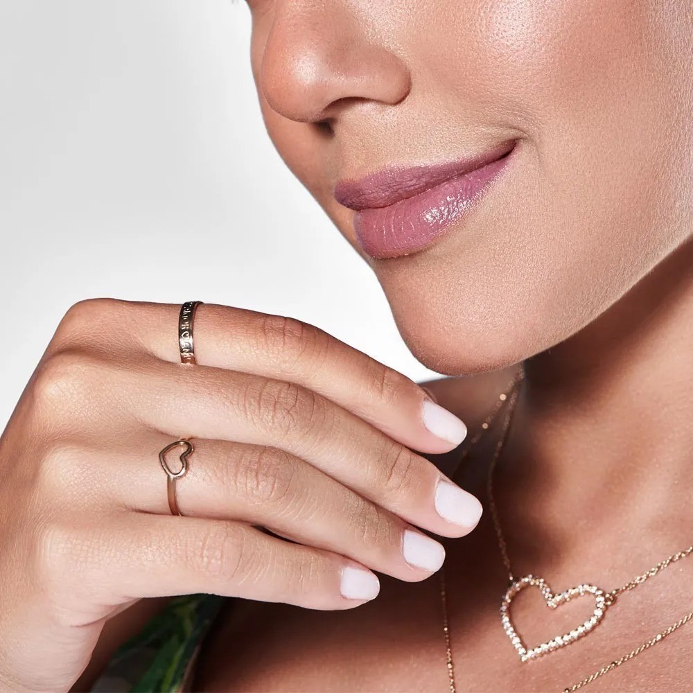 Descrição anel "skinny ring" com coração vazado na parte superior.