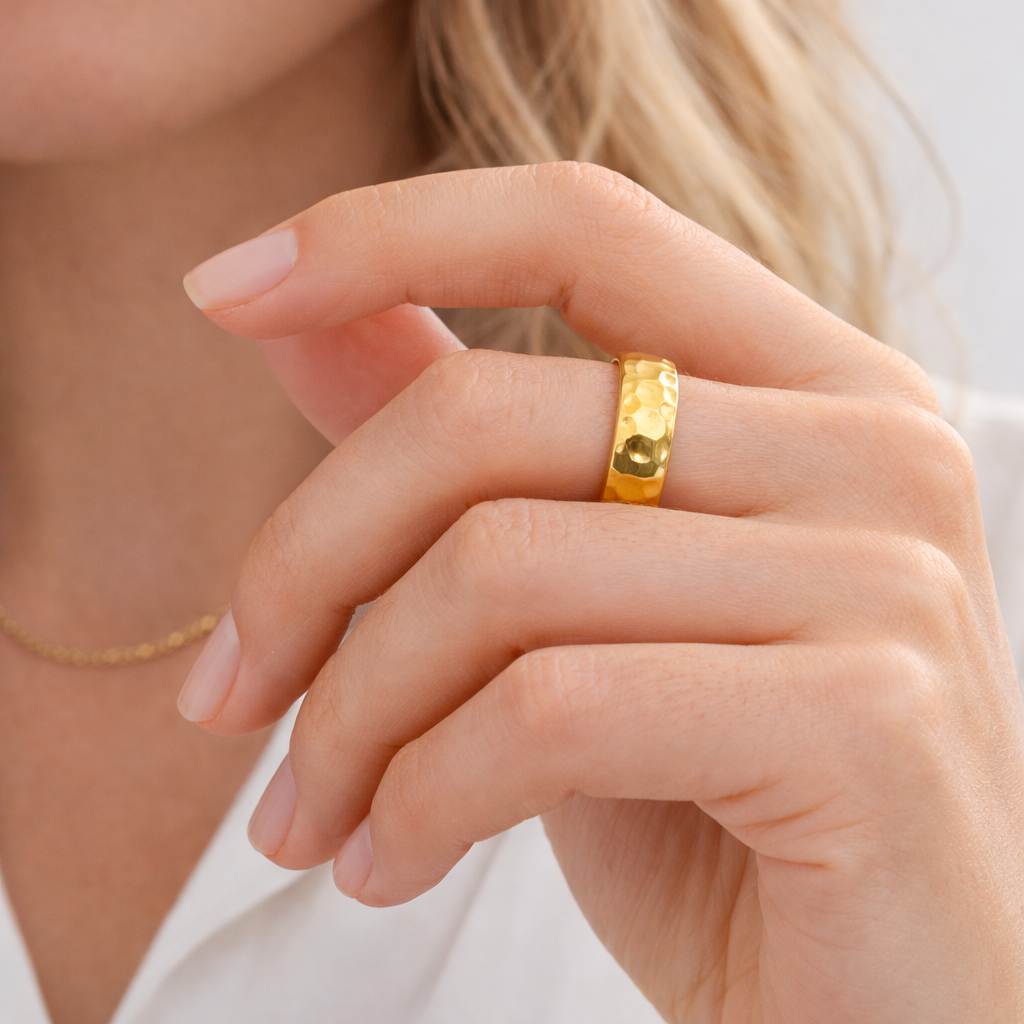 Anel Dourado Aço Inox 8mm Textura Martelada | Anel Masculino e Feminino Unissex
