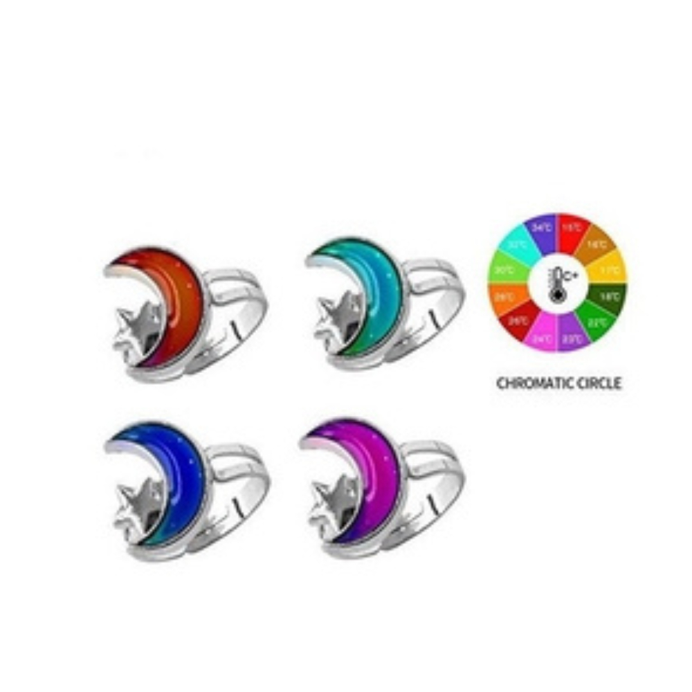 Modelo: Lua Estrela Ajustável: Sim (serve para todos os tamanhos) Muda de cor: Sim, Com pedras: Não Material: Metal/Polimero Resistente: Sim Atenção: Cuidado ao manipular produtos químicos ou água quando estiver utilizando o anel, pata não danifica-lo Dúvidas nos contate via chat! Boas compras!