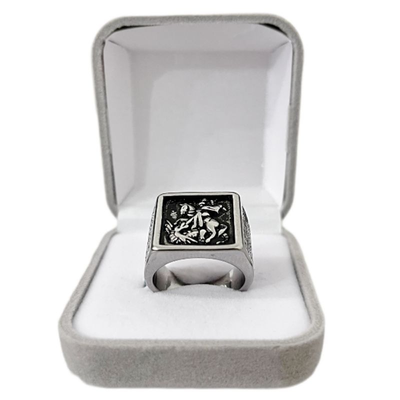 Anel Masculino Oração São Jorge Aço Inox 316L Proteção Prateado