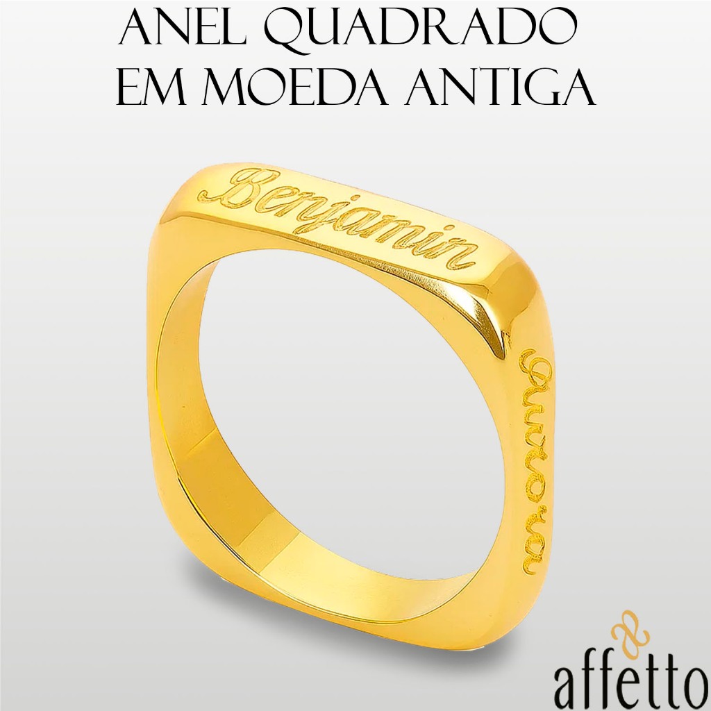 Anel Quadrado Em Moeda Antiga Com Gravação De Nomes Personalizado